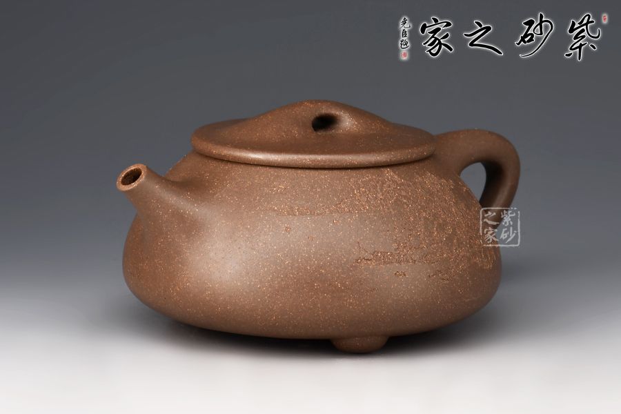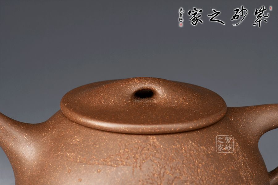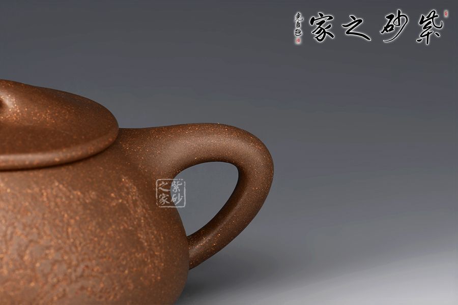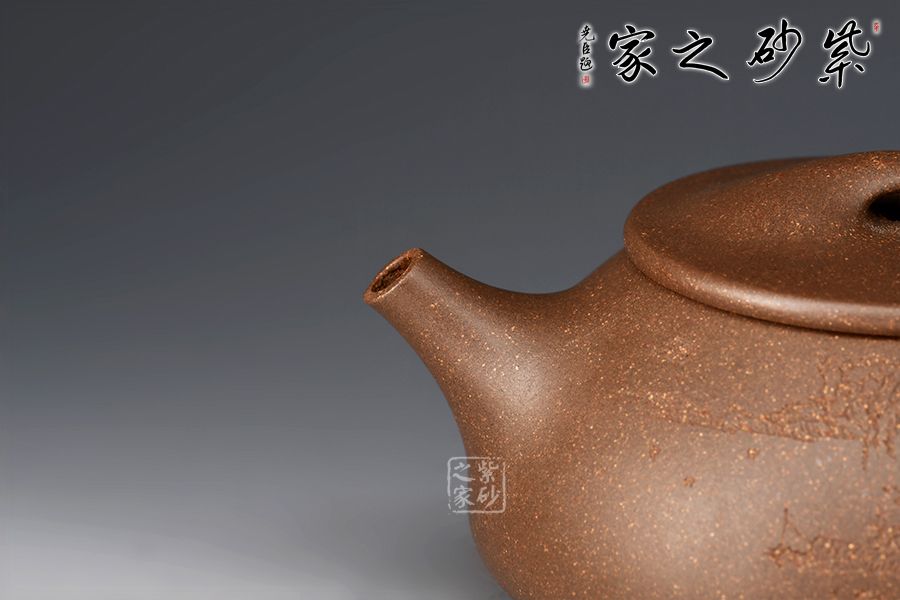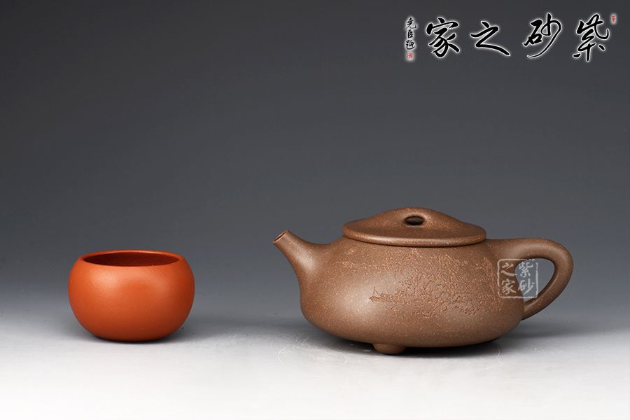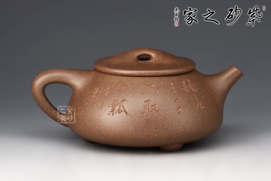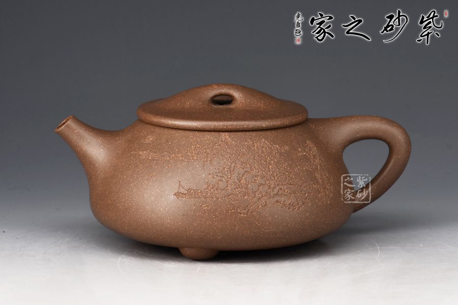 此壺為作者摹古而作,以景舟石瓢為型,青段作胎,全手工精制而成。壺身呈八字造型,豐潤飽滿,曲線柔和流暢,平壓蓋、橋鈕,拿取自如,直流簡而有力,出水順暢,壺把上豐下斂,與壺身之型形成和諧的美學效果,底部三乳足給人以輕靈而穩(wěn)重之感。壺身雙面陶刻,正面刻繪山水,寥寥幾筆勾勒出江南美景,意境不凡!反面刻繪“弱水三千只取一瓢”。整器精工細作,形體端秀,骨力勁挺,出水爽利,且上手舒適,極易泡養(yǎng),是一把頗為實用的殺茶利器。