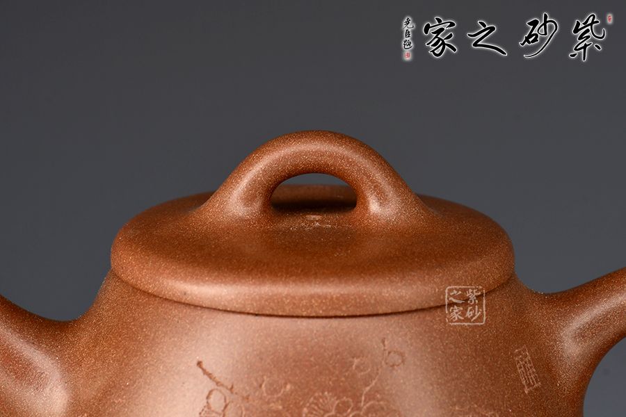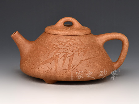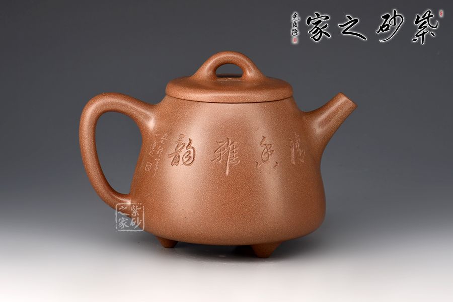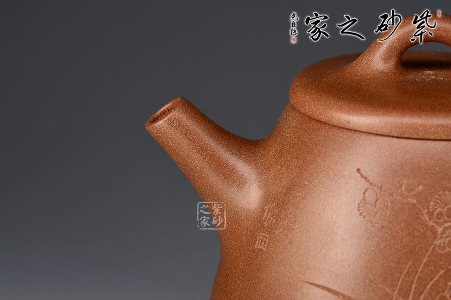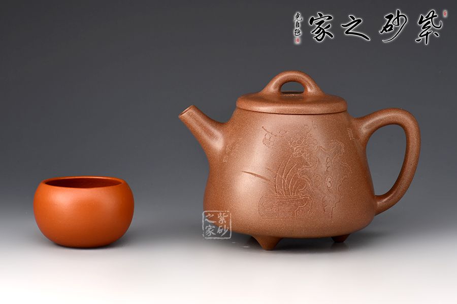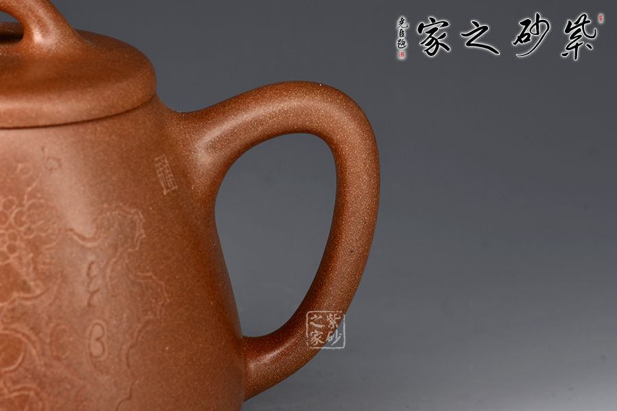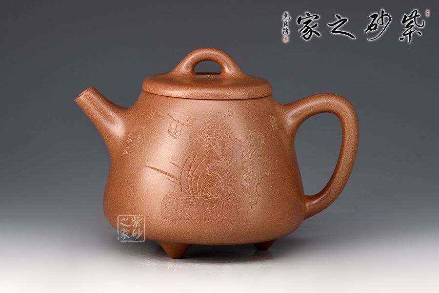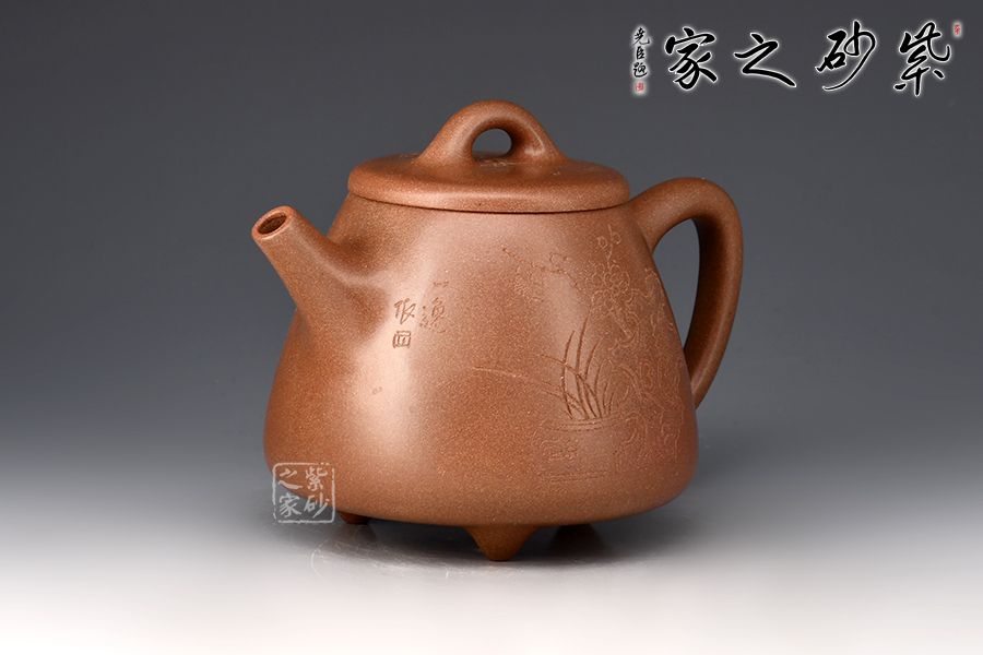 此壺以桃花泥作胎,成色溫潤古雅。身桶拔高,上窄下寬,氣韻充沛。平蓋、橋鈕、直流、倒三角把比例和諧,相得益彰,底部三乳足平添輕盈。壺身正面刻繪蘭花,太湖石,反面配以“清香雅韻”,意境清幽高雅。整器線條流暢,工藝精良,容量400cc,是一款非常實用的殺茶利器,性價比極高。
