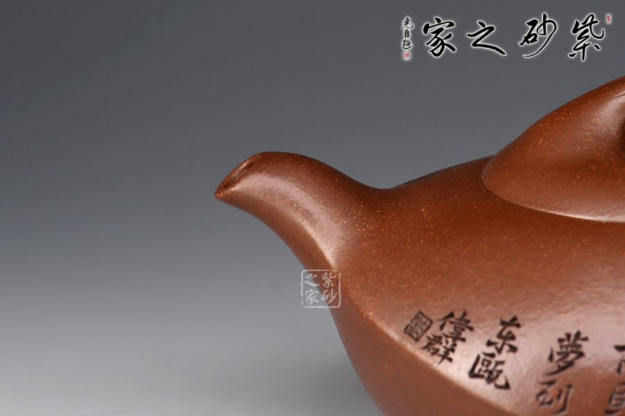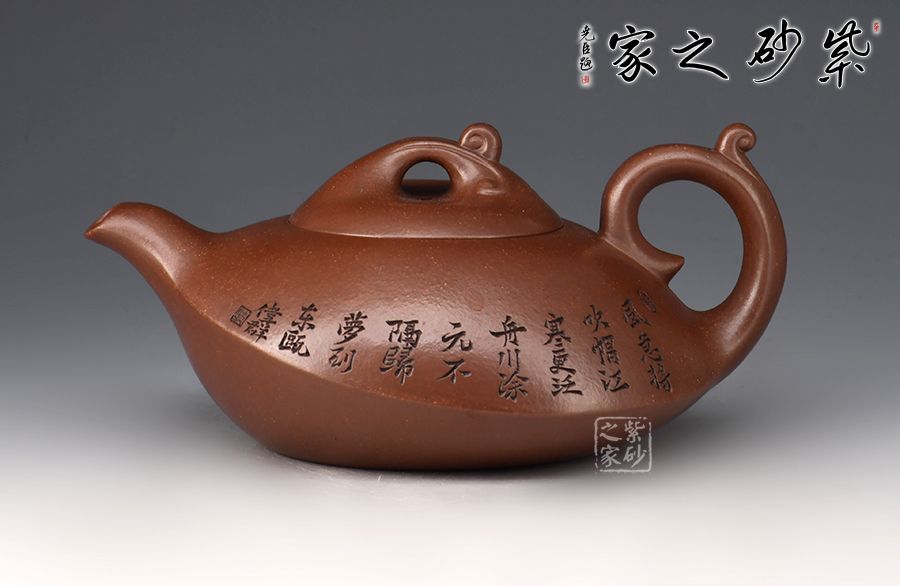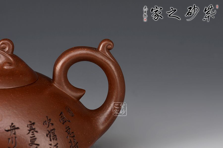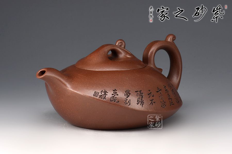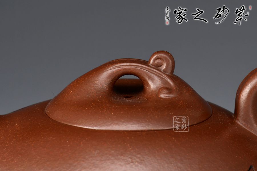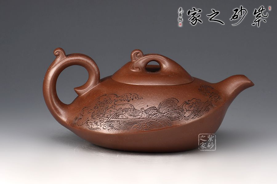 壺身一條棱線分割上下,相交處線條平和利落,截蓋、橋鈕,流、把纖長靈巧。加之浪花裝飾可謂“碧波”。范偉群大師刻繪裝飾,收藏首選。獨特線條流暢,深邃迷人,置于掌心品茗把玩,樂趣無窮也。