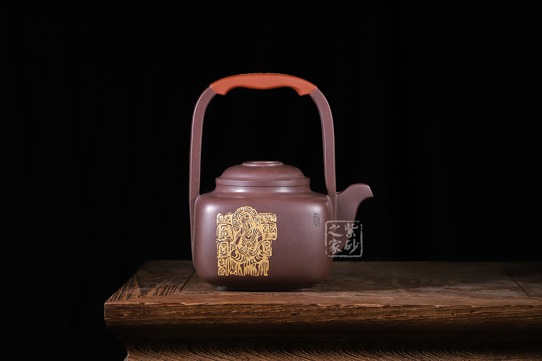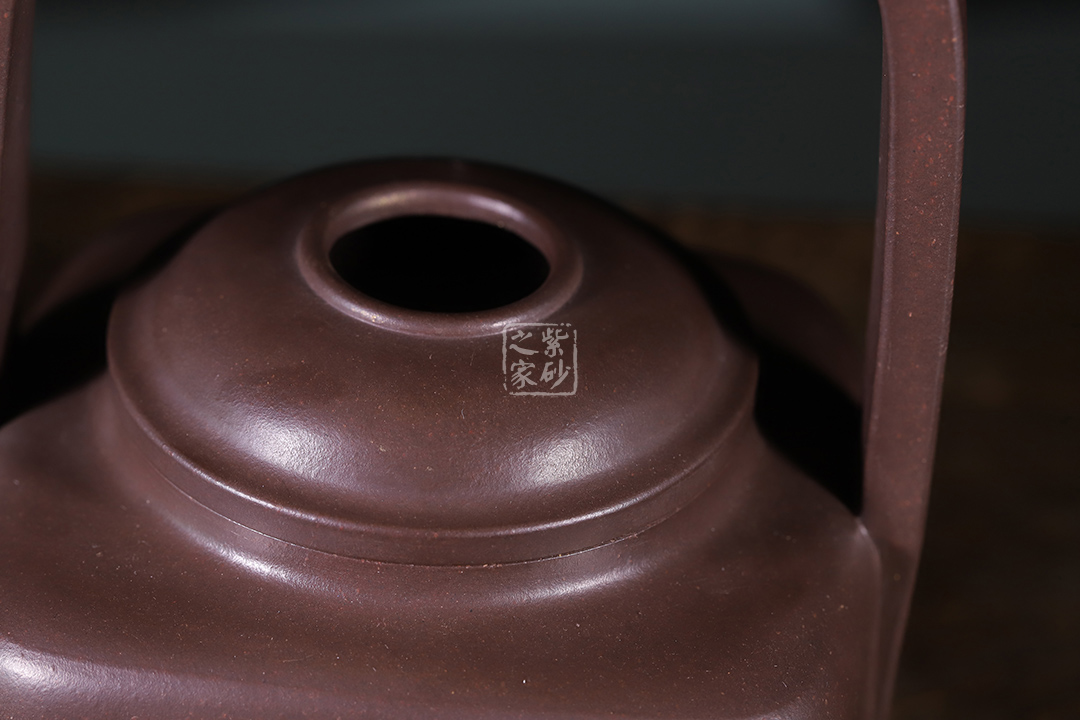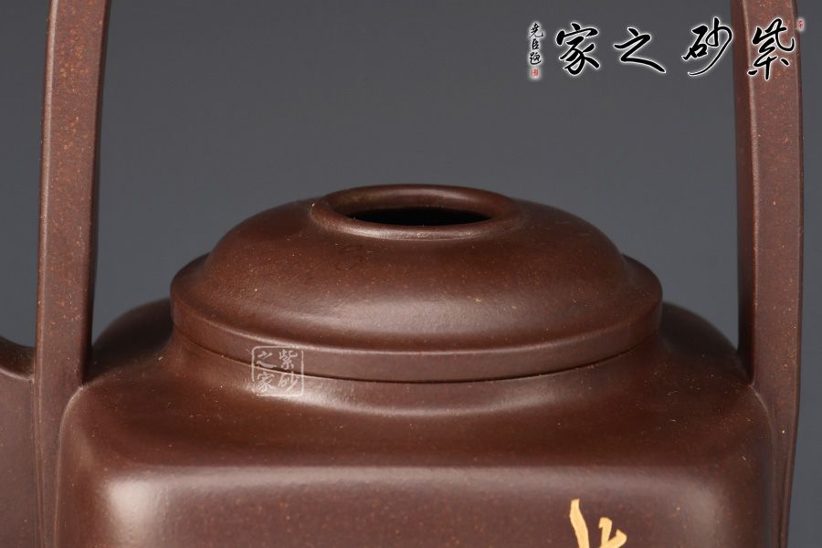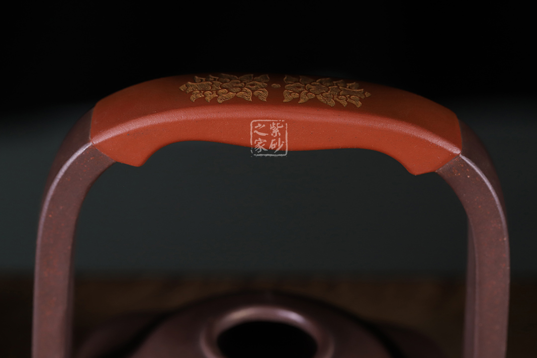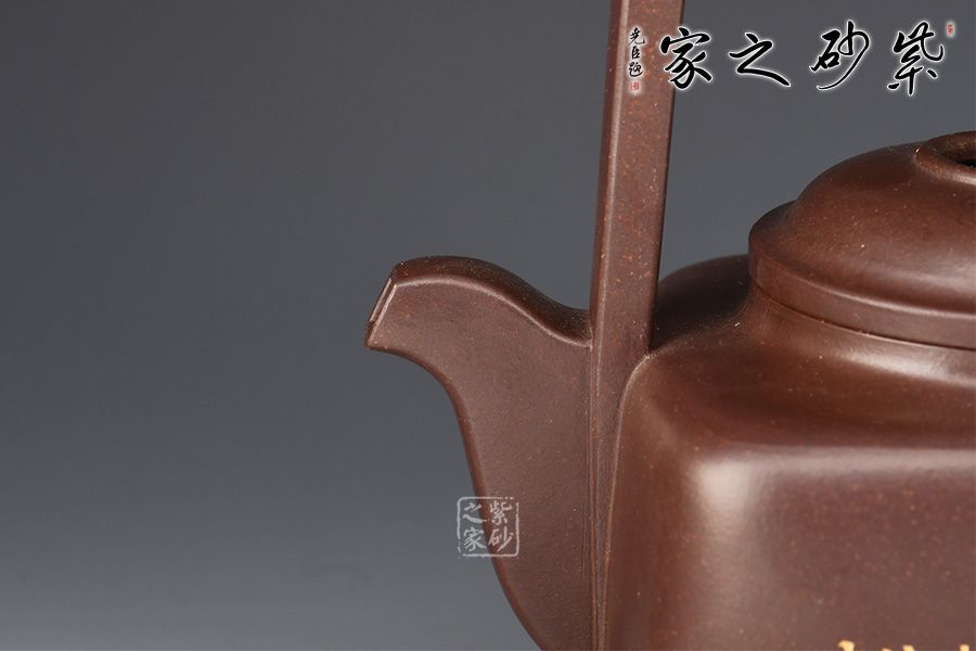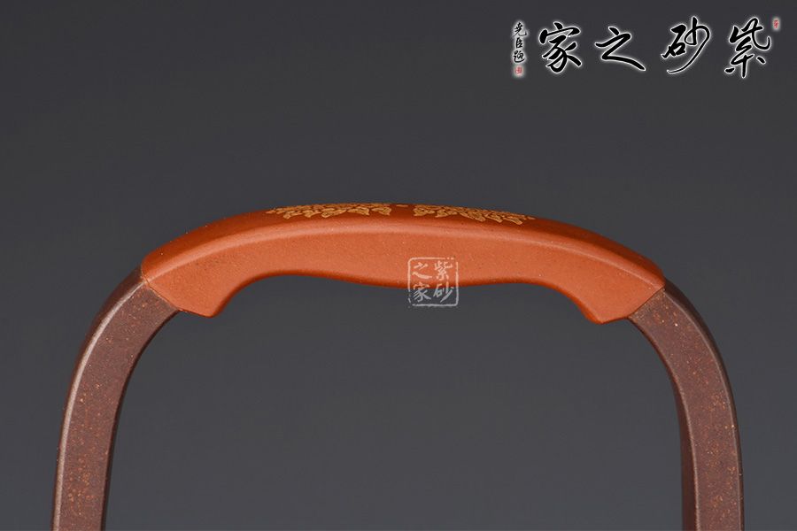作品采用雙色泥制作,因“紅”與“鴻”諧音,以此為寓意恰到好處,壺的點睛之處為提梁壺把,點明鴻運當(dāng)頭之意。壺身方圓結(jié)合,線條流暢。壓蓋設(shè)計,恰似無縫相接,氣密性極佳;方形壺把蜿蜒向上,暗接渾厚精湛,出水勁道有力。