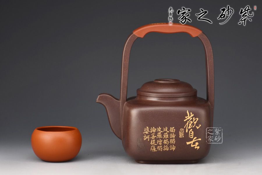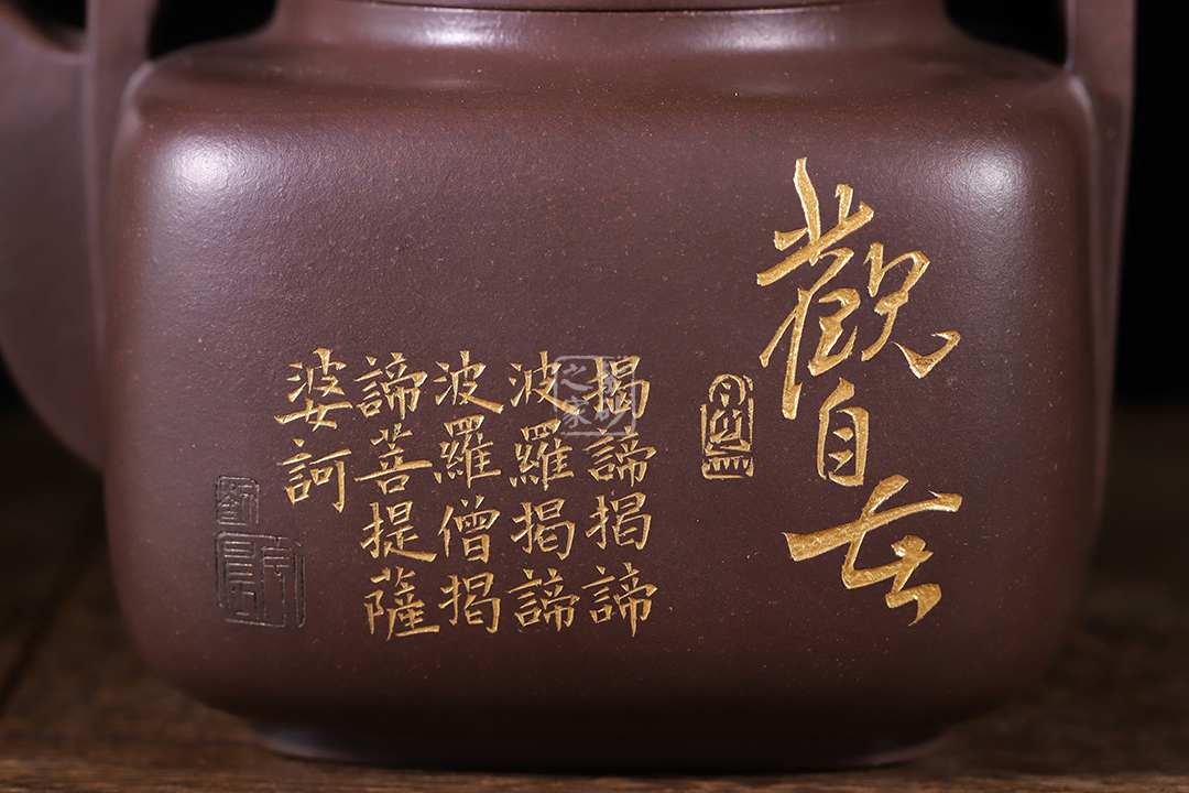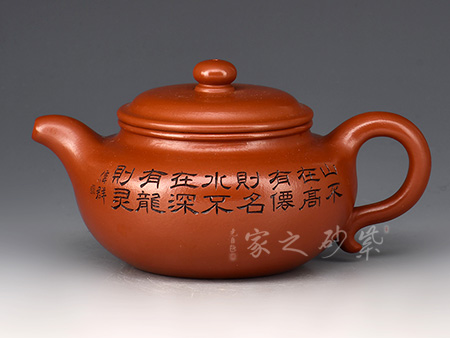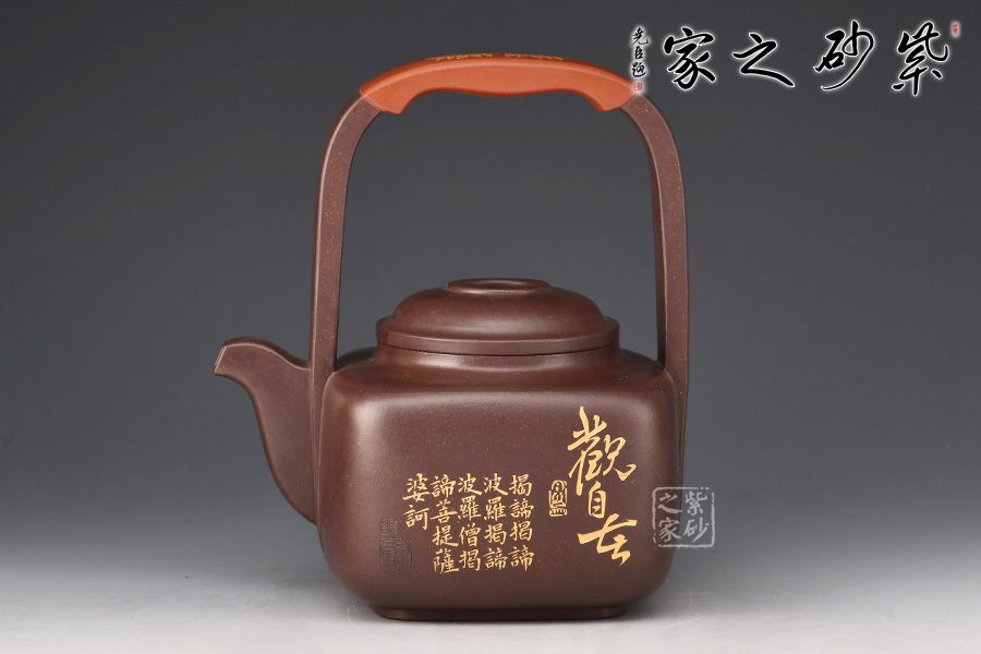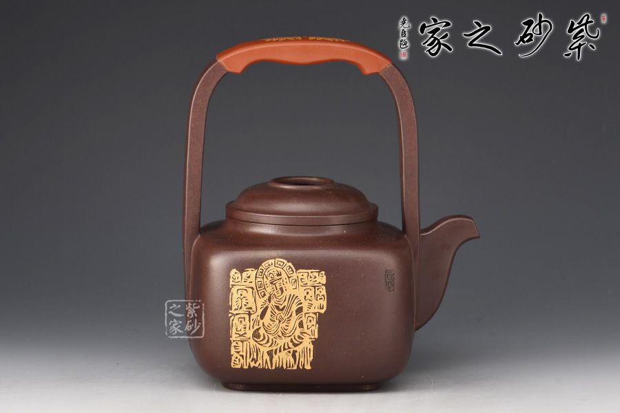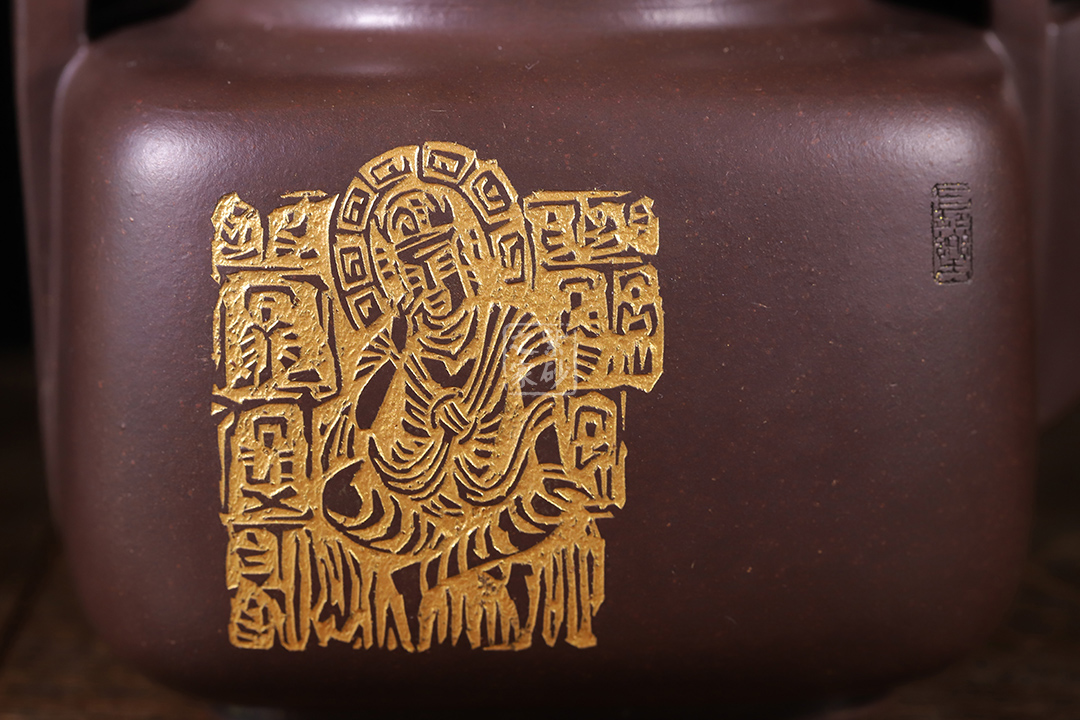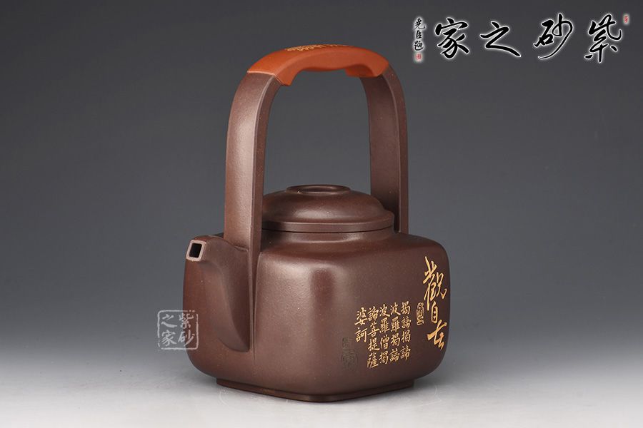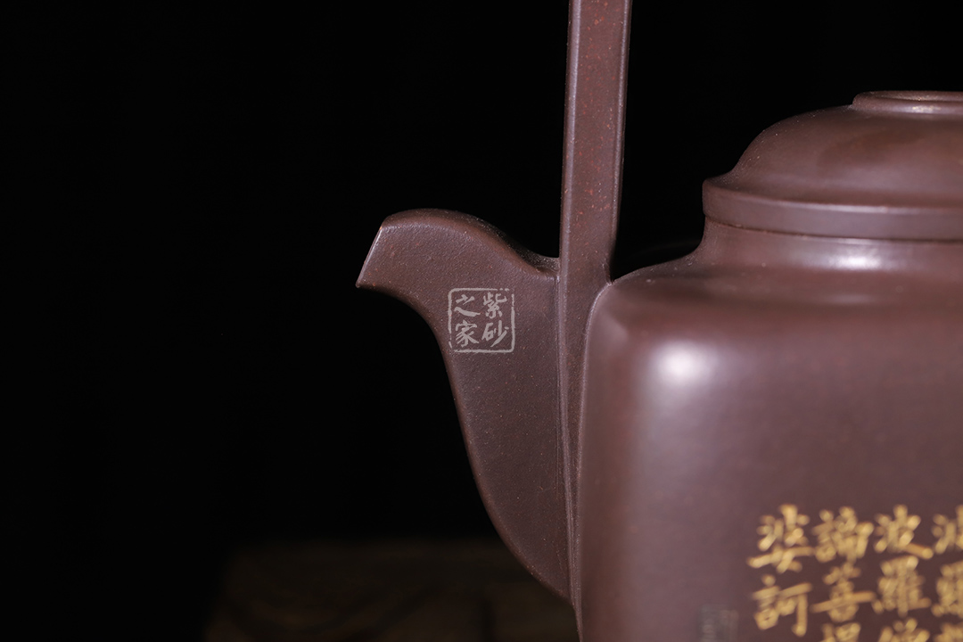 作品采用雙色泥制作,因“紅”與“鴻”諧音,以此為寓意恰到好處,壺的點睛之處為提梁壺把,點明鴻運當(dāng)頭之意。壺身方圓結(jié)合,線條流暢。壓蓋設(shè)計,恰似無縫相接,氣密性極佳;方形壺把蜿蜒向上,暗接渾厚精湛,出水勁道有力。