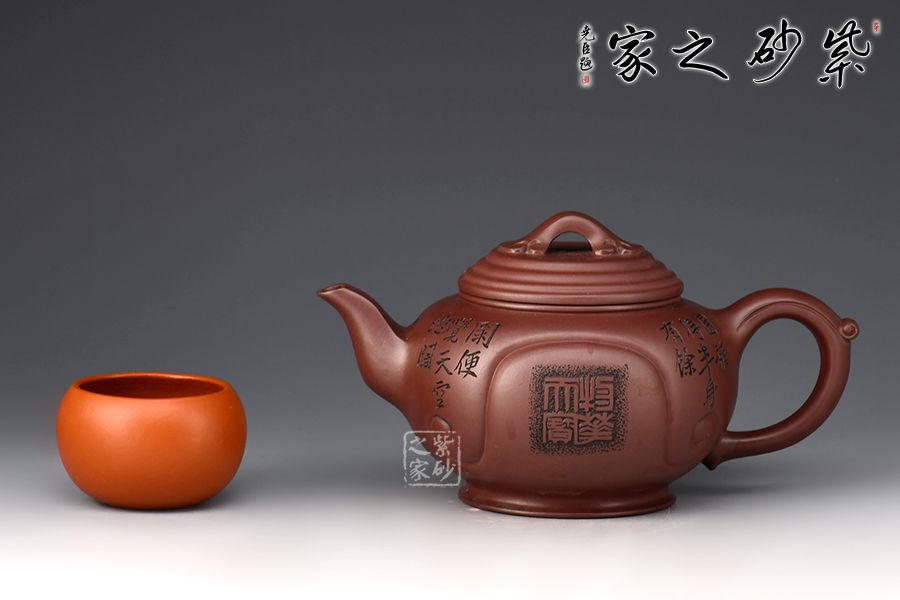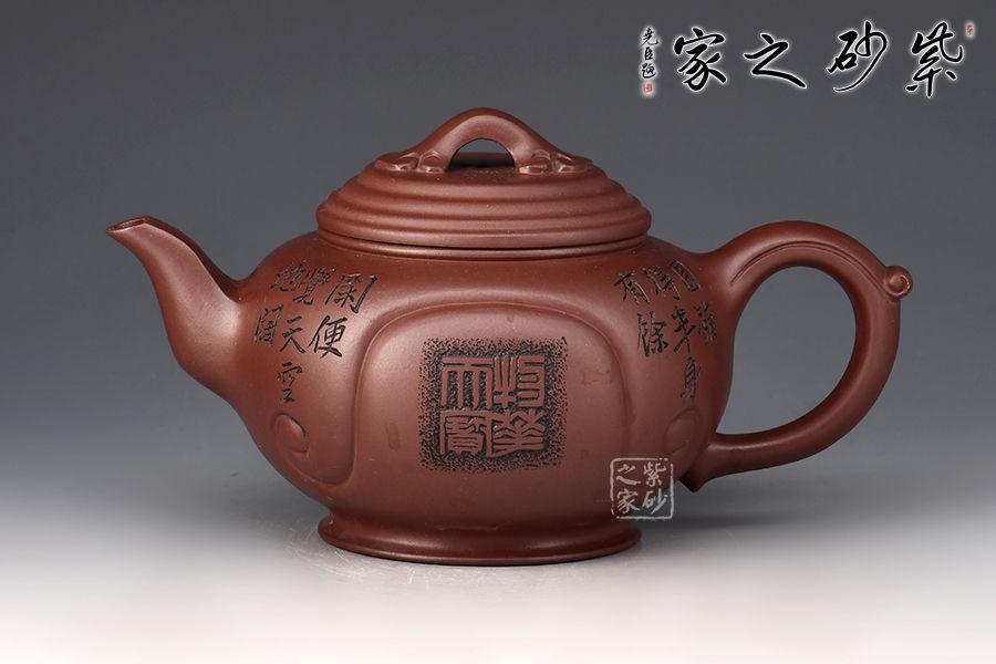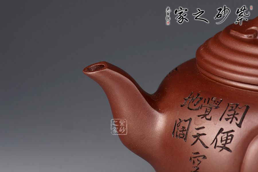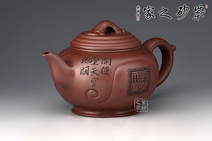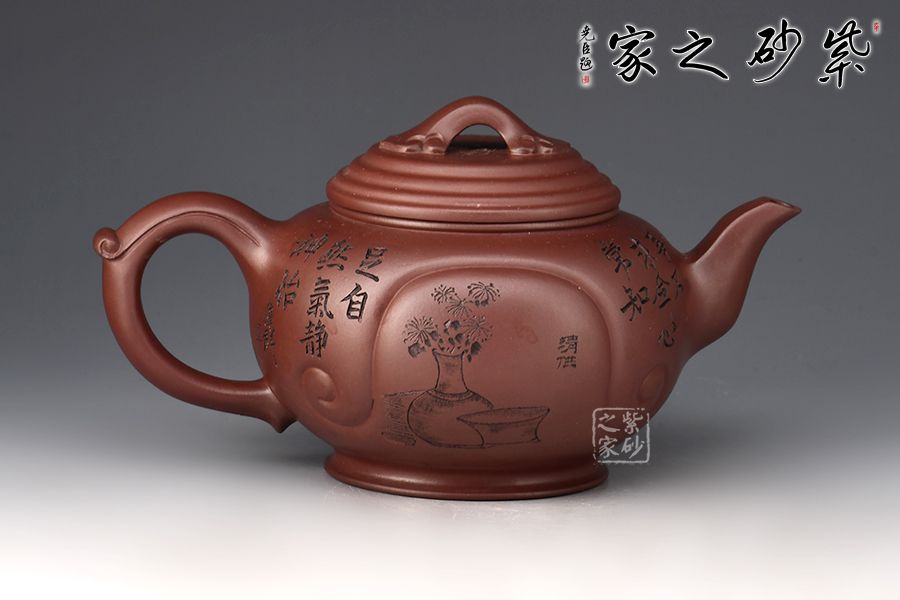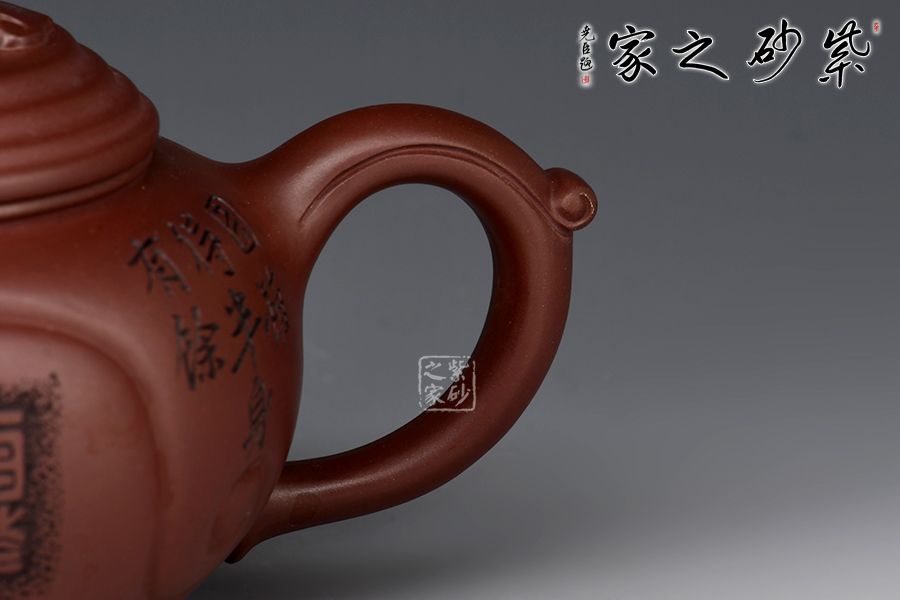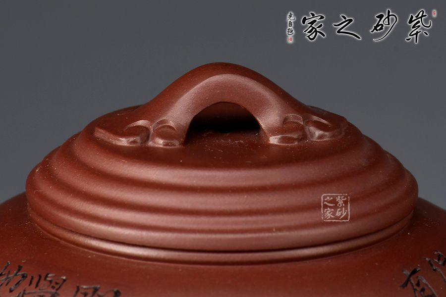壺身穩(wěn)重端莊大方,線條圓潤,橋形如意鈕,精巧別致。流、把比例和諧,出水爽利,壺面、把、鈕如意紋裝飾,飽含美好祝福。范偉群大師陶刻裝飾,乃玩藏重器!