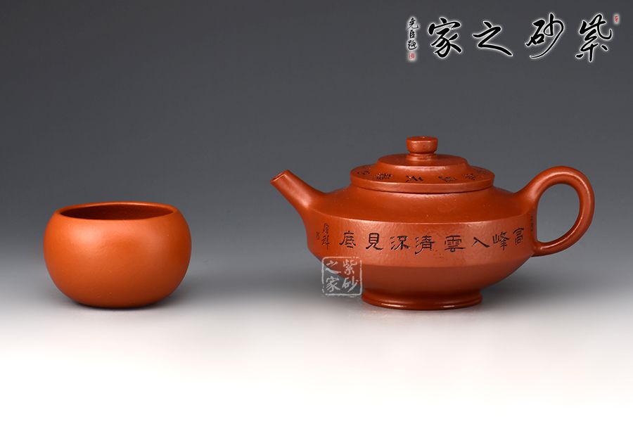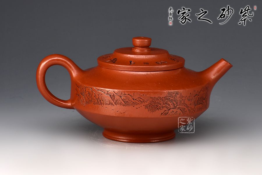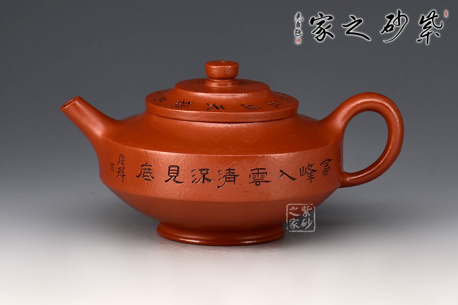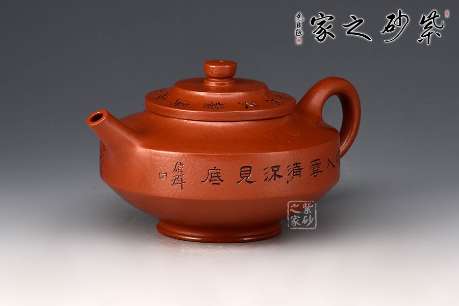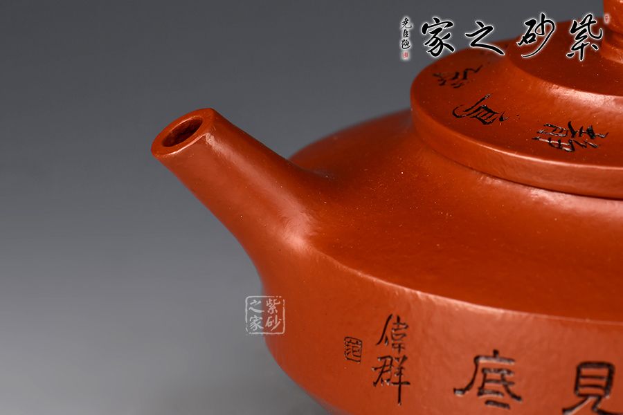 壺身方圓并濟,腹部以平行的兩圈股線分割,上下逐漸收斂。圓柱鈕、直嘴、圈把貫通一氣,比例恰到好處。壺身范偉群大師刻繪詩詞,刀刀精雕細琢,雙正高合制,升值加倍!整器線面明快,渾樸雅致,制作精美,盡顯儒雅之風,是一把欣賞、把玩、實用的佳作,值得收藏。