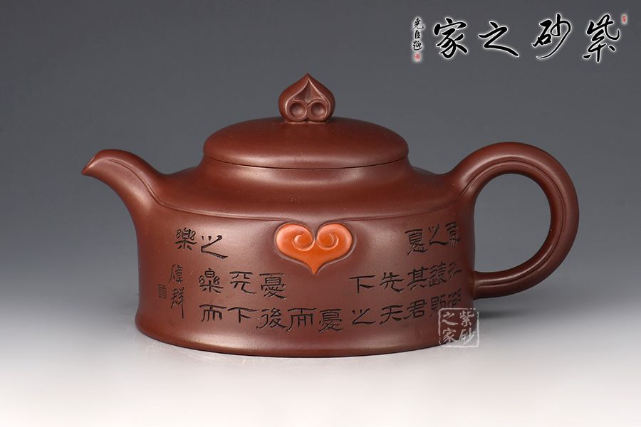 整器線條簡潔明快,壓蓋敦實,心形壺鈕,極具巧思。流、把于壺肩自然胥出,二彎嘴出水爽利,耳把拿捏順手。范偉群大師陶刻裝飾,刻繪心形圖案,呼應(yīng)壺意,加以詩詞點綴,刀刀精雕細(xì)琢,工藝精湛,推薦收藏!