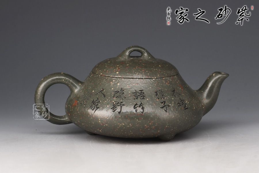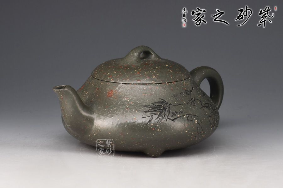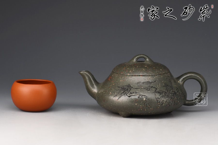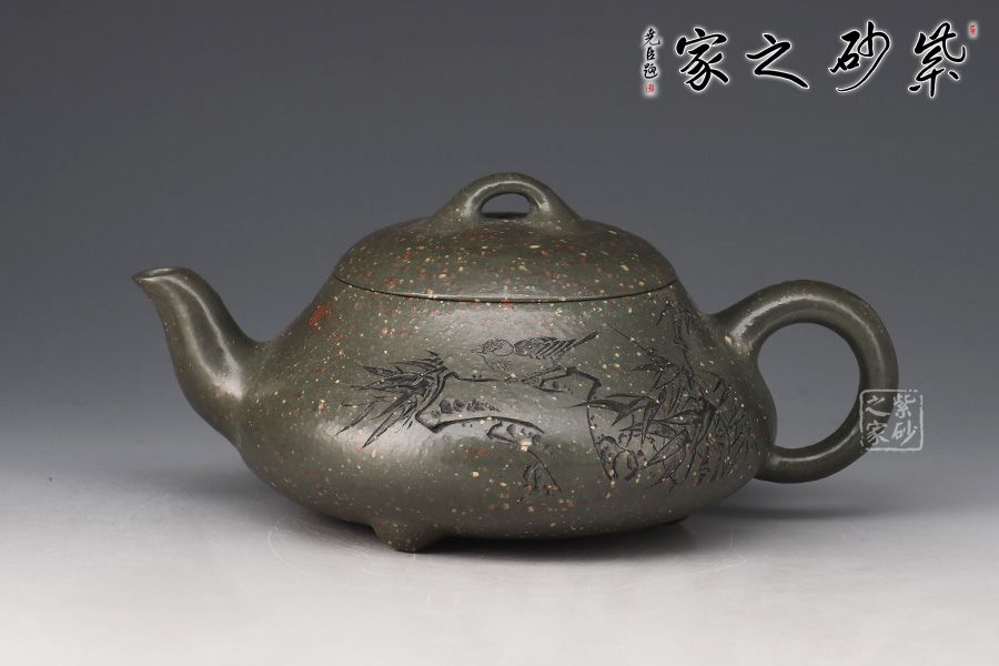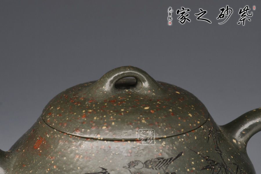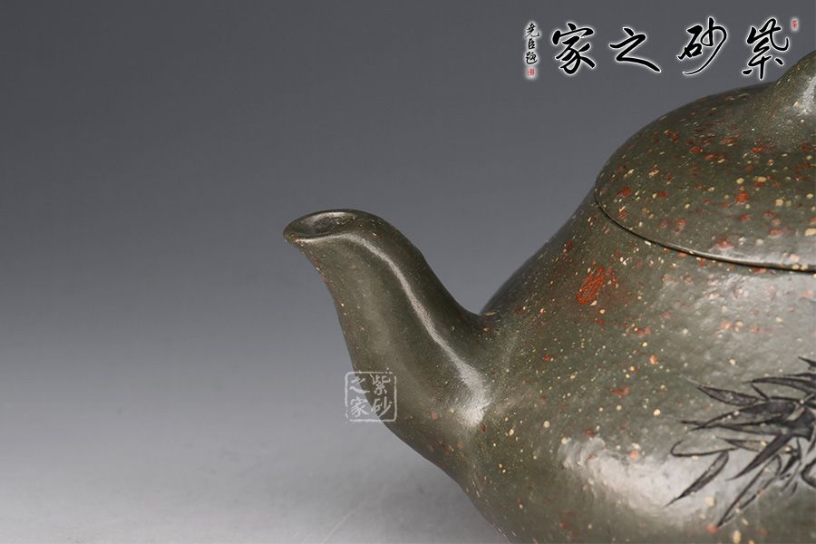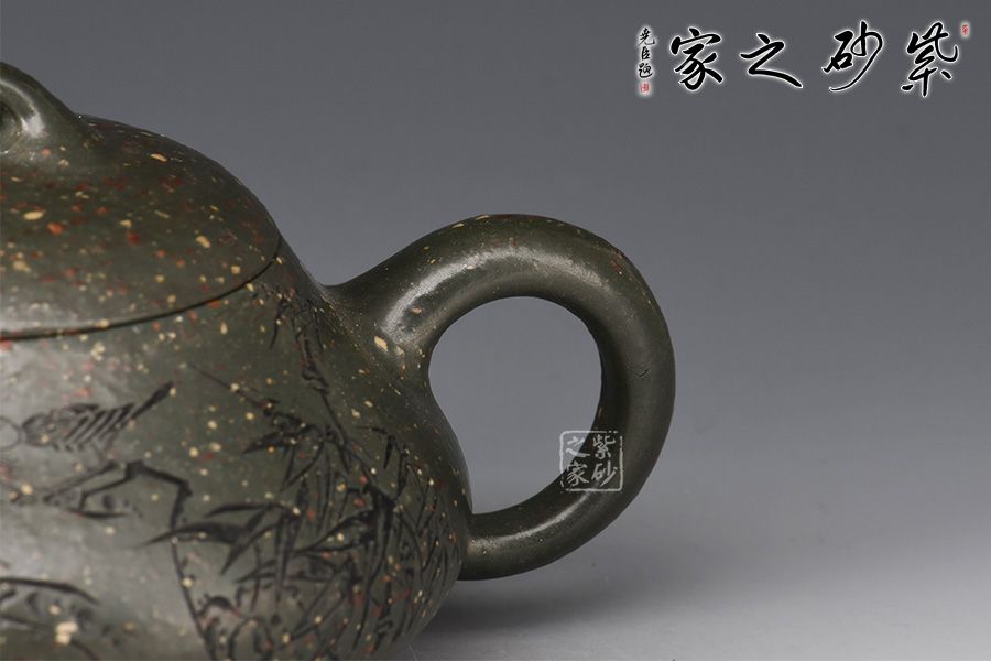 此壺為作者摹古而作,整器古味盎然,線條過渡柔和,壺腹豐潤(rùn)飽滿,橋鈕與穹蓋渾若一體。彎流自壺腹胥出,曲線上揚(yáng),出水爽利,圈把與之對(duì)稱,比例和諧。線條轉(zhuǎn)折柔順,各部件雋永耐看。