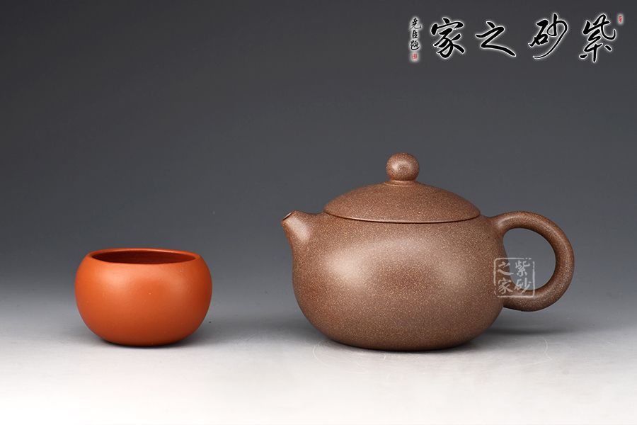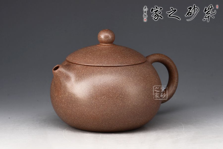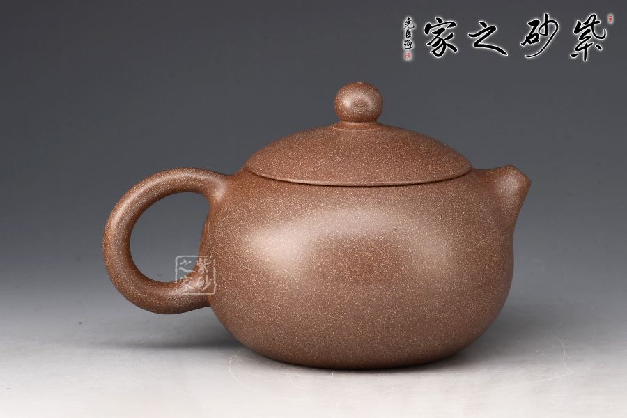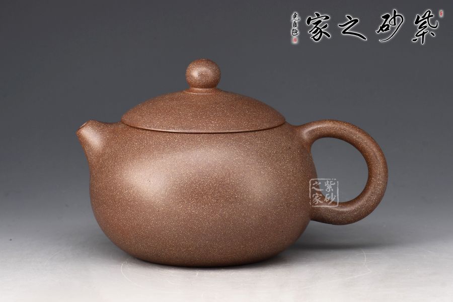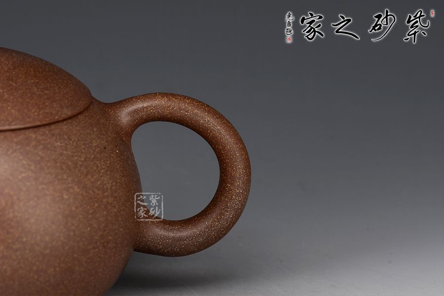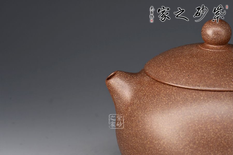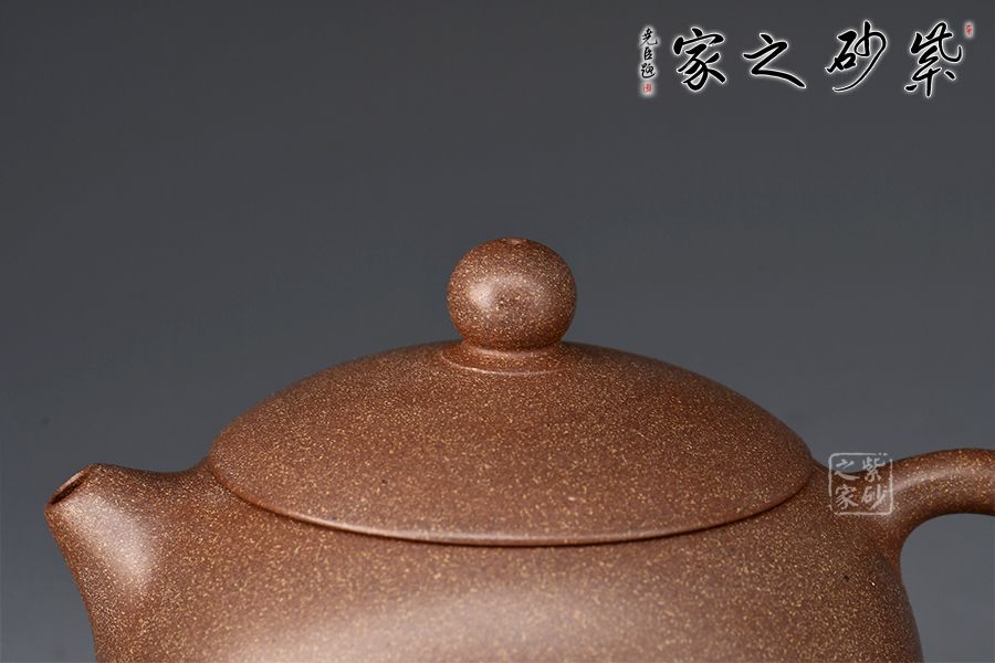 此壺為作者選用桃花泥,造型取傳統(tǒng)西施之巧致,壺身豐腴圓潤,隆起的截蓋與之完美相連,宛若一位溫婉可人的少女,體態(tài)誘人嫵媚。壺鈕以一粒珠飾之,壺嘴短小俊俏,典雅的倒把如女子的發(fā)髻,增添一絲成熟韻味。整器古樸拙雅,做工精巧,270cc黃金容量,實用性佳,是一把高性價比的殺茶利器。