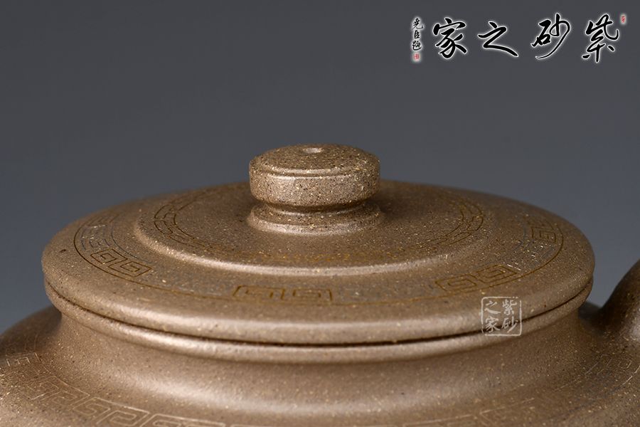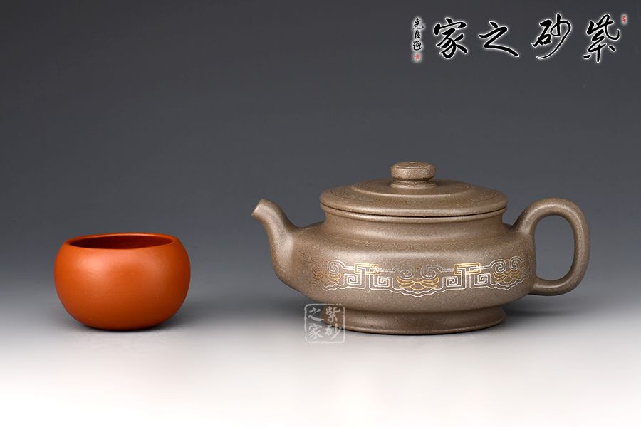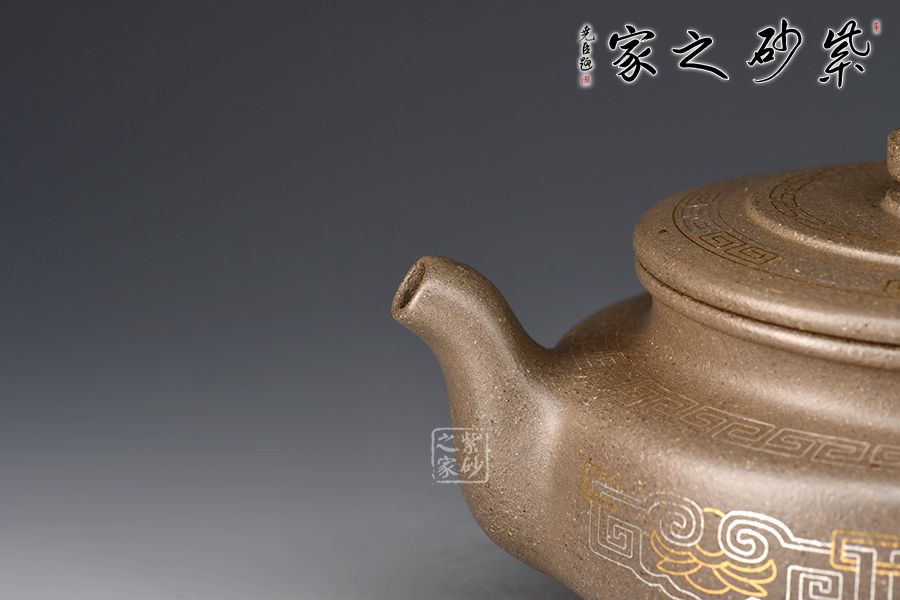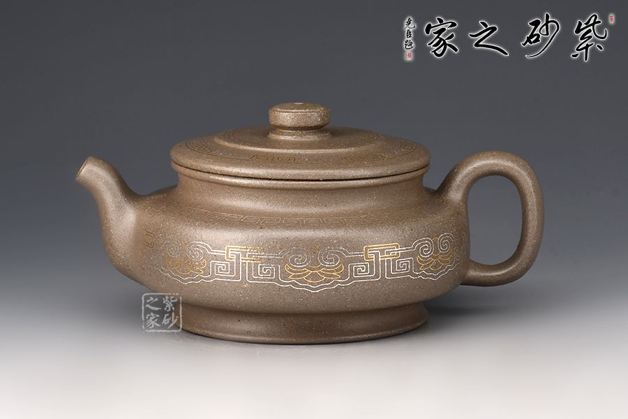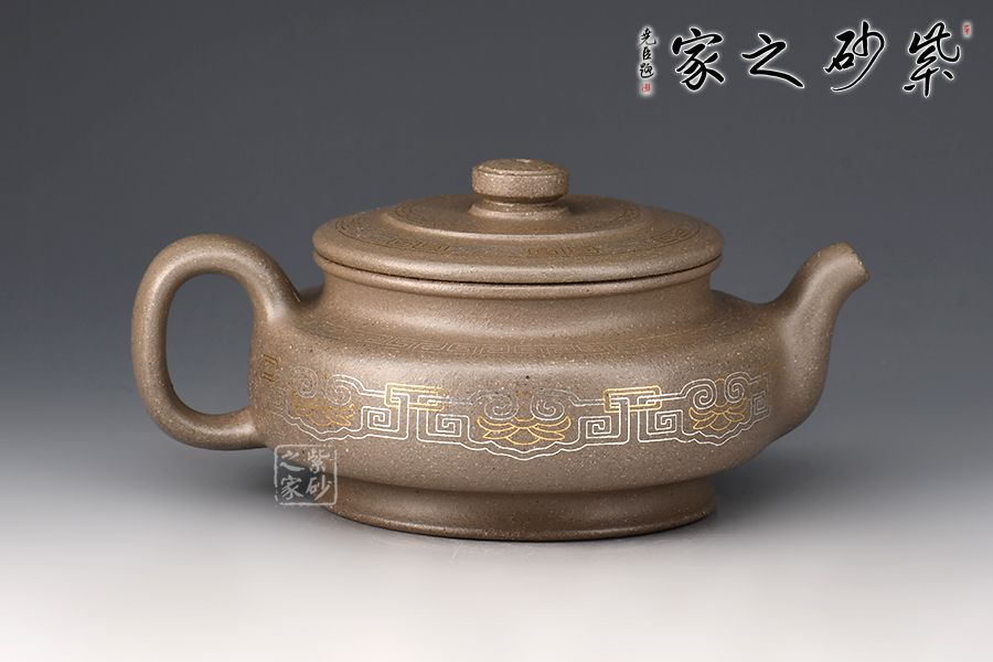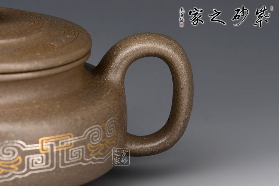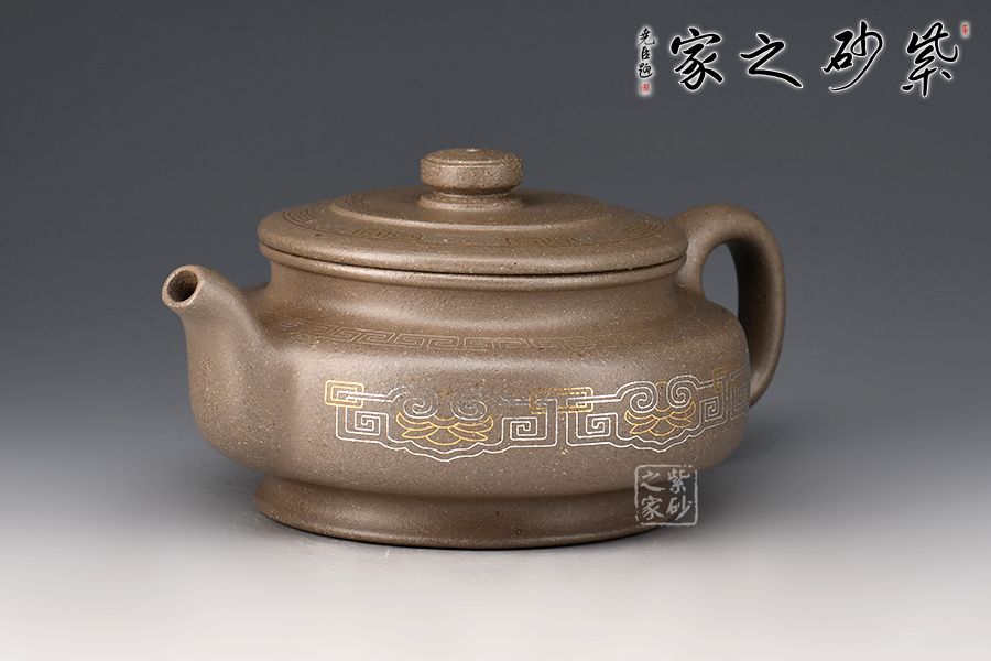 整壺猶如一個(gè)圓盤,敦厚大氣,圓圓的平蓋壓于壺口,與壺身的闊大、規(guī)整相應(yīng)和,同時(shí)的流把均在頂面上采用平面造型,看起來更為協(xié)調(diào)一致,彰顯大度之風(fēng)。壺肩略微呈坡狀,隔空觀之,形成柔美和緩的過渡面。壺腹金銀絲鑲嵌裝飾,富貴華麗。