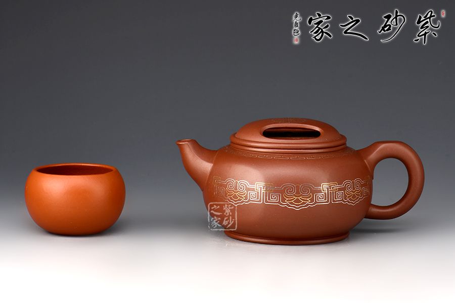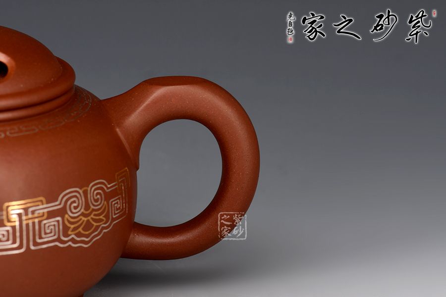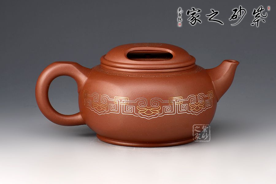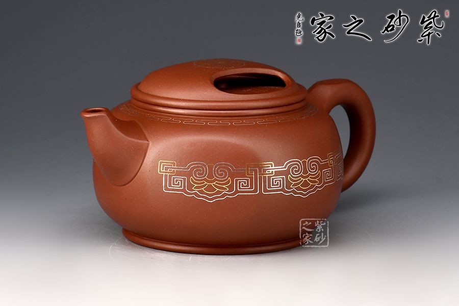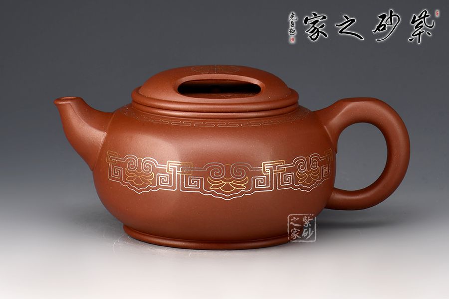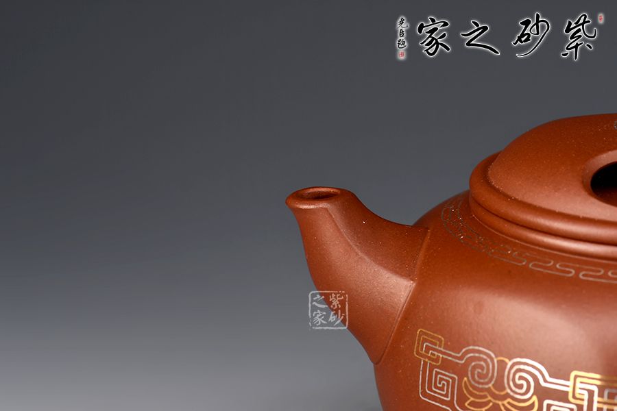 牛蓋蓮子壺為紫砂壺經(jīng)典器型之一,此壺在經(jīng)典壺形的基礎(chǔ)上加以創(chuàng)新,渾圓六方壺身,剛?cè)岵?jì),線(xiàn)條優(yōu)美自然。壺蓋上兩個(gè)對(duì)稱(chēng)的橢圓型孔,似牛之雙目,炯炯有神,氣韻生動(dòng)。金銀鑲嵌裝飾,富貴華麗。整壺構(gòu)思嚴(yán)謹(jǐn),比例得當(dāng),富有層次感,彎流嘴出水爽利,耳把端握舒適。色澤喜人,極易包漿,實(shí)性用強(qiáng),實(shí)屬品茶之佳品。