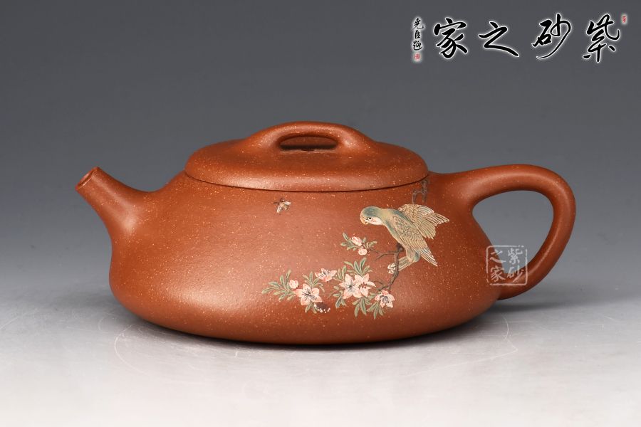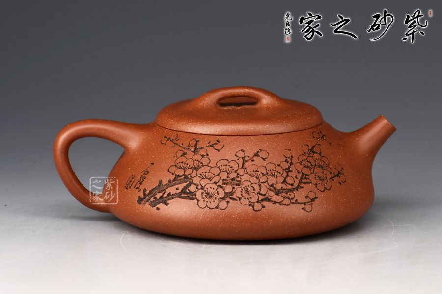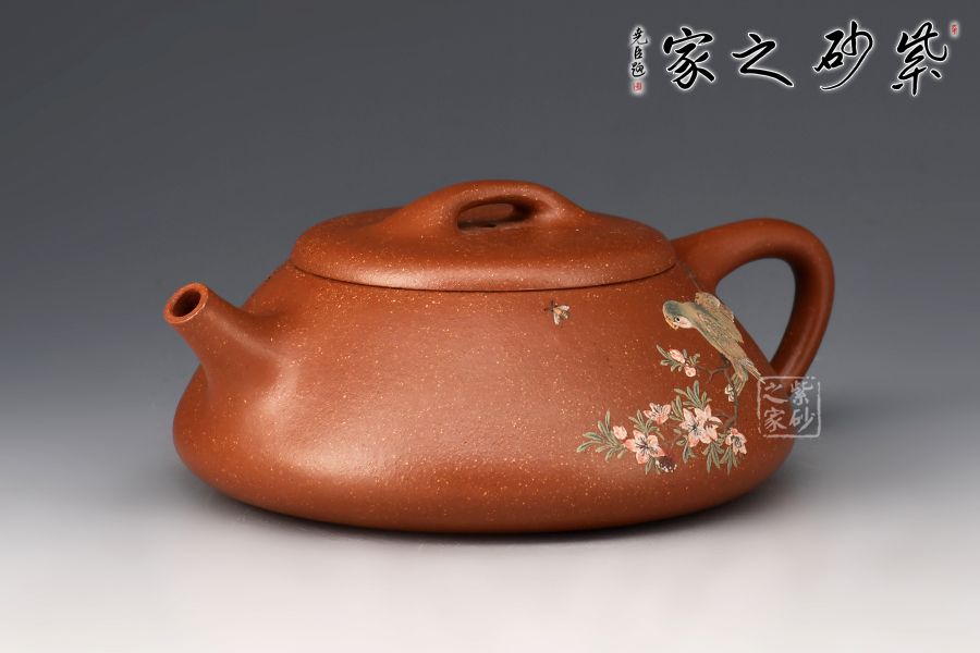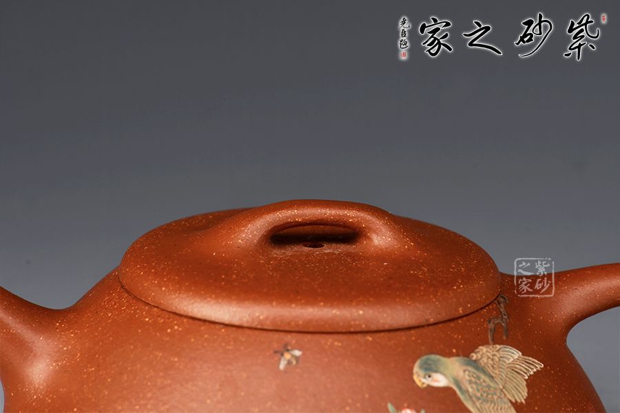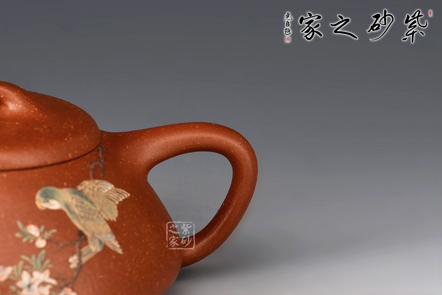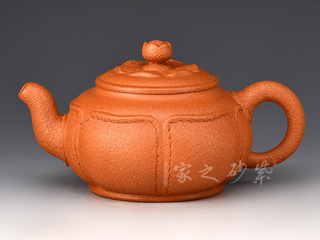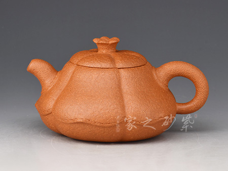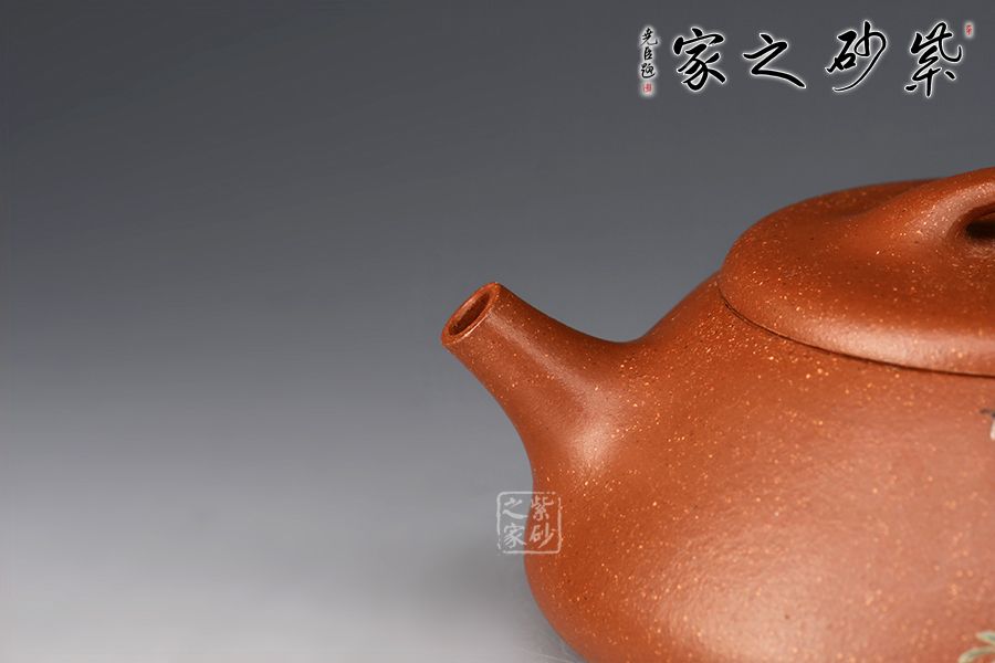 此壺為作者選用金降坡泥,全手工精制而成。造型在傳統(tǒng)子冶石瓢的基礎(chǔ)上精心改良,既體現(xiàn)了石瓢的剛勁有力,又融合了圓壺的溫潤柔美。壺身較傳統(tǒng)子冶矮了許多,配之大口蓋,使投茶更方便。拱橋壺鈕潤澤和順,便于揭拿的同時(shí),也為整體增添一股靈氣。直流自然胥出,出水爽利,與壺身宛若一體。壺把呈倒三角之勢,與壺身之型互補(bǔ),形成和諧的美學(xué)效果。