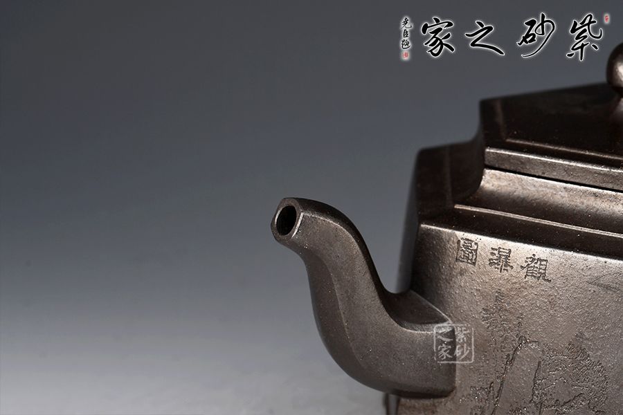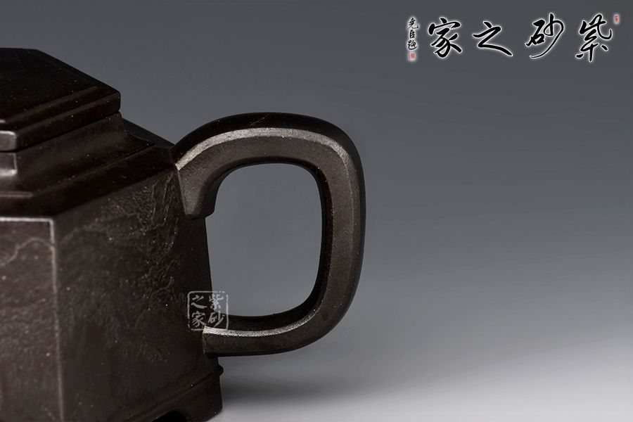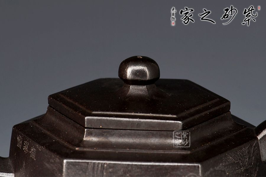 整壺線條清晰,比例得當(dāng)。此壺身乃六片鑲接而成,壺蓋也為六邊,流、把亦化圓為方,各部銜接自然光滑。全壺均布以六條曲線,依壺造勢,壺體線條飽滿,向外賁張,鈕、蓋、把、流全部線條均衡,張弛有度,開闔得宜。