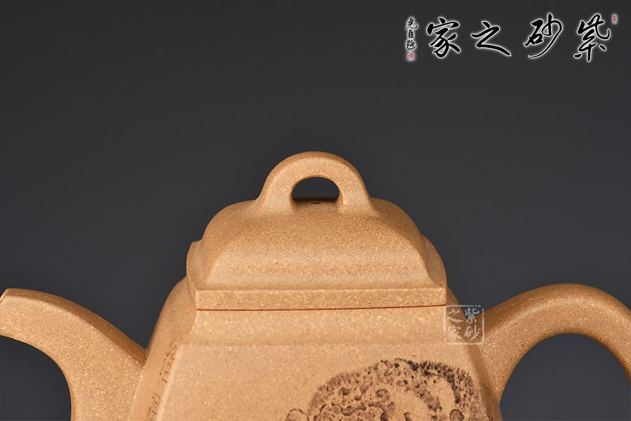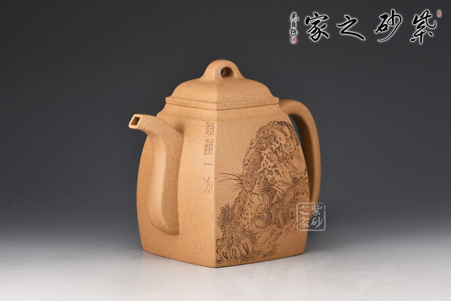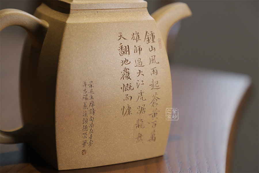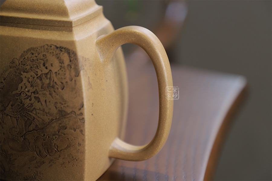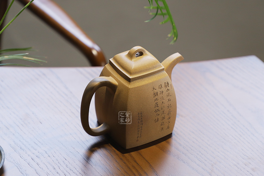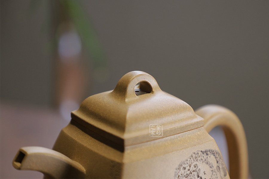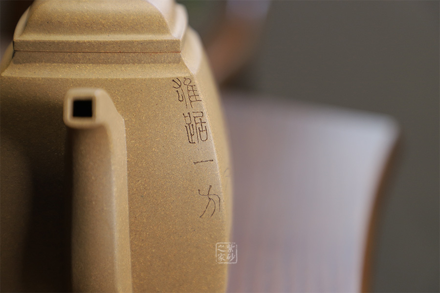 此壺摹古而做,壺體扁方形,壺流以四分之三平貼壺身,把圈寓方,鈕為橋梁式,壺蓋密壓蓋口吻合,方中有圓,圓中寓方,想必這才是此壺最好的詮釋;橋梁式細(xì)鈕,把捏方便,三彎嘴,直中見曲,橢形壺把,提拿穩(wěn)當(dāng)。