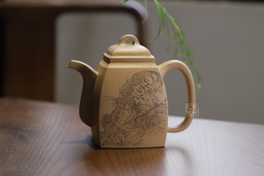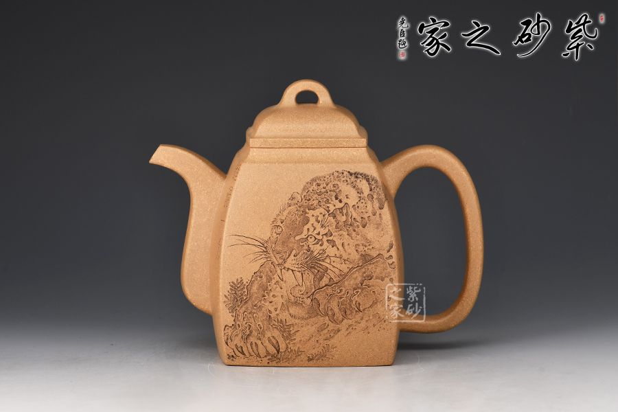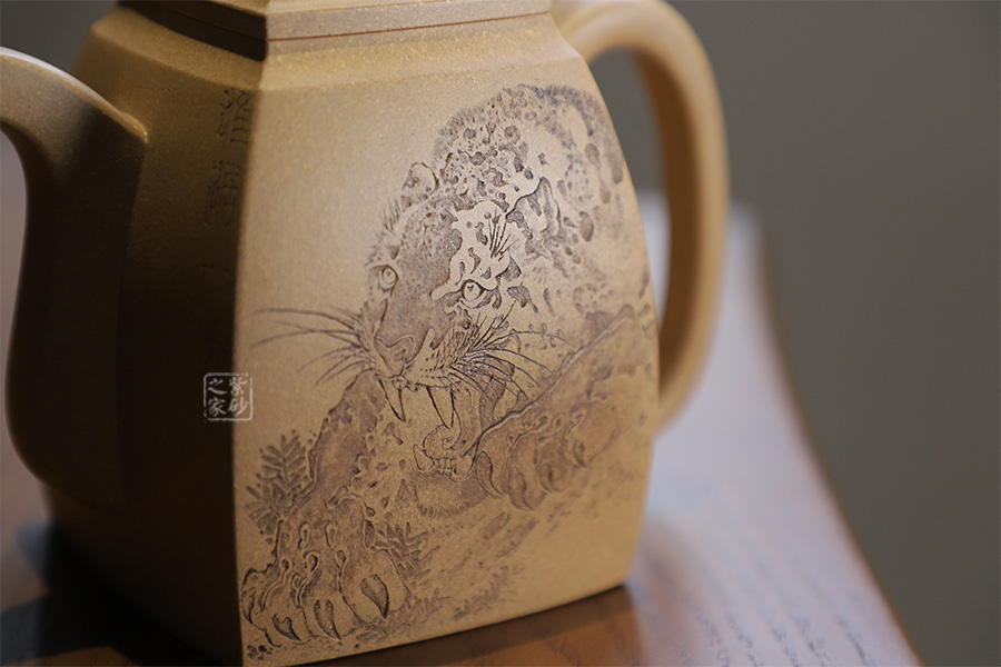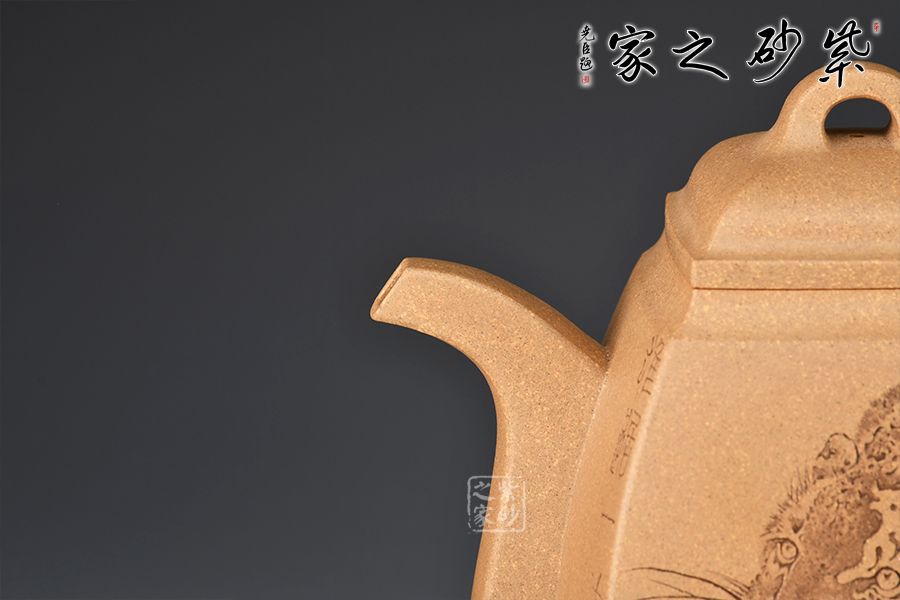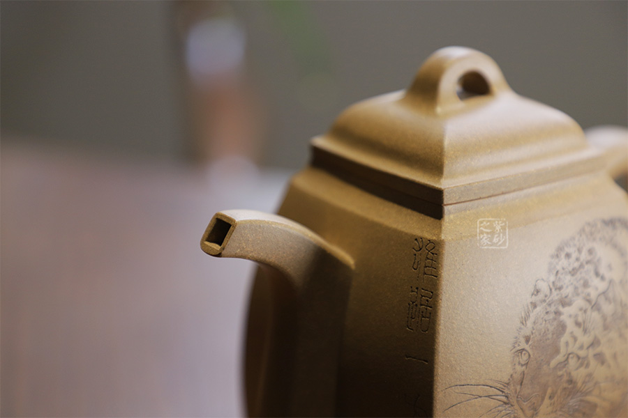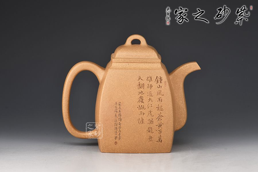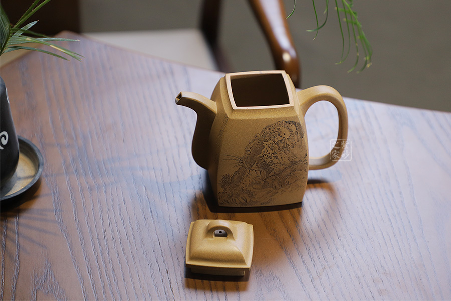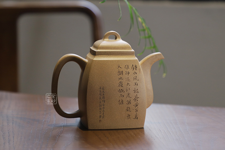 此壺摹古而做,壺體扁方形,壺流以四分之三平貼壺身,把圈寓方,鈕為橋梁式,壺蓋密壓蓋口吻合,方中有圓,圓中寓方,想必這才是此壺最好的詮釋;橋梁式細(xì)鈕,把捏方便,三彎嘴,直中見曲,橢形壺把,提拿穩(wěn)當(dāng)。