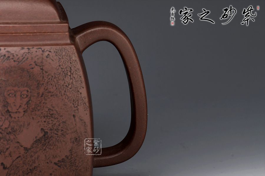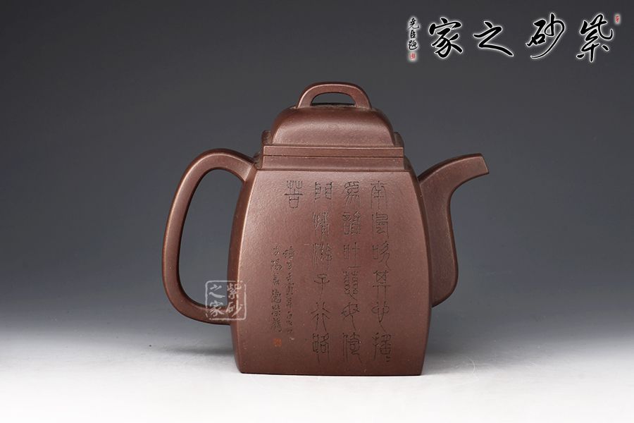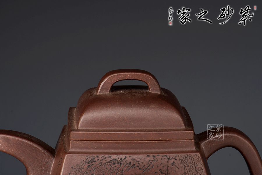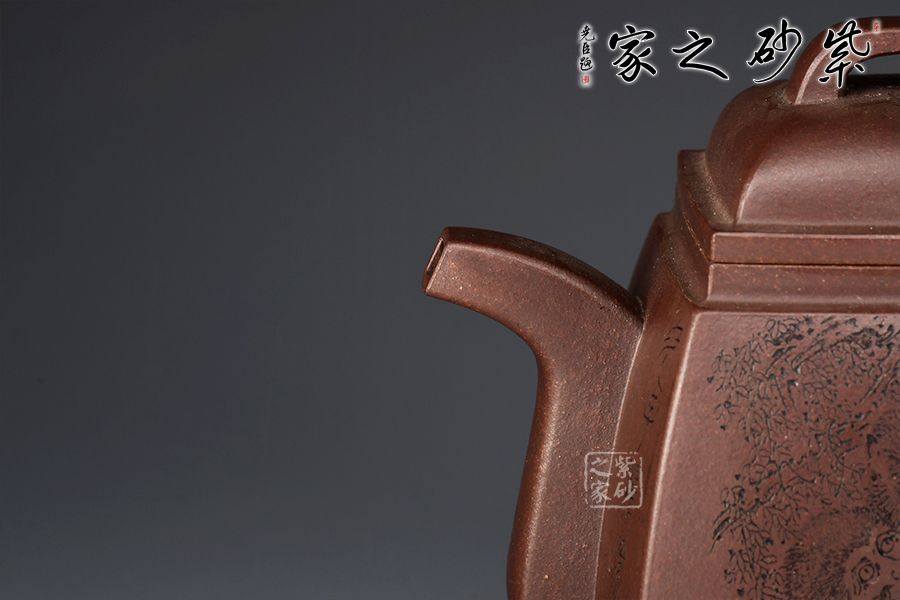 此壺摹古而做,壺體扁方形,壺流以四分之三平貼壺身,把圈寓方,鈕為橋梁式,壺蓋密壓蓋口吻合,方中有圓,圓中寓方,想必這才是此壺最好的詮釋;橋梁式細(xì)鈕,把捏方便,三彎嘴,直中見曲,橢形壺把,提拿穩(wěn)當(dāng)。