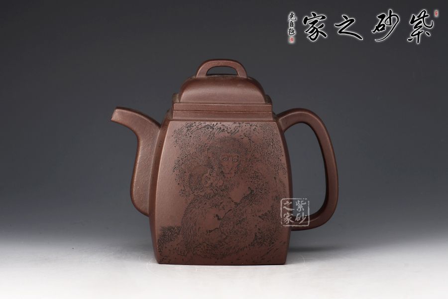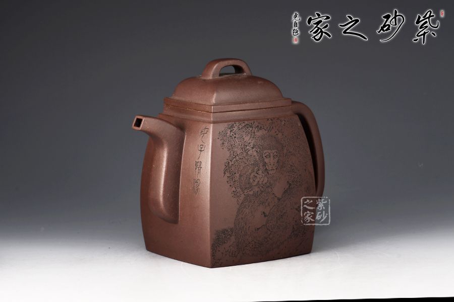 壺身雙面陶刻,正面兩只猴子,母子情深,形態(tài)逼真,反面刻繪詩詞,文字氣息濃厚。整器造型呈方,簡練質(zhì)樸,制技精湛,線面挺括,為幾何形方器中不可多見的佳作。