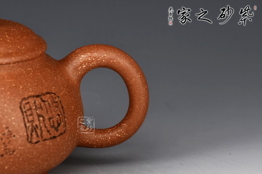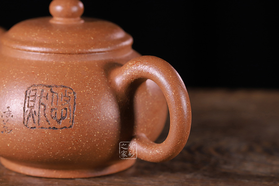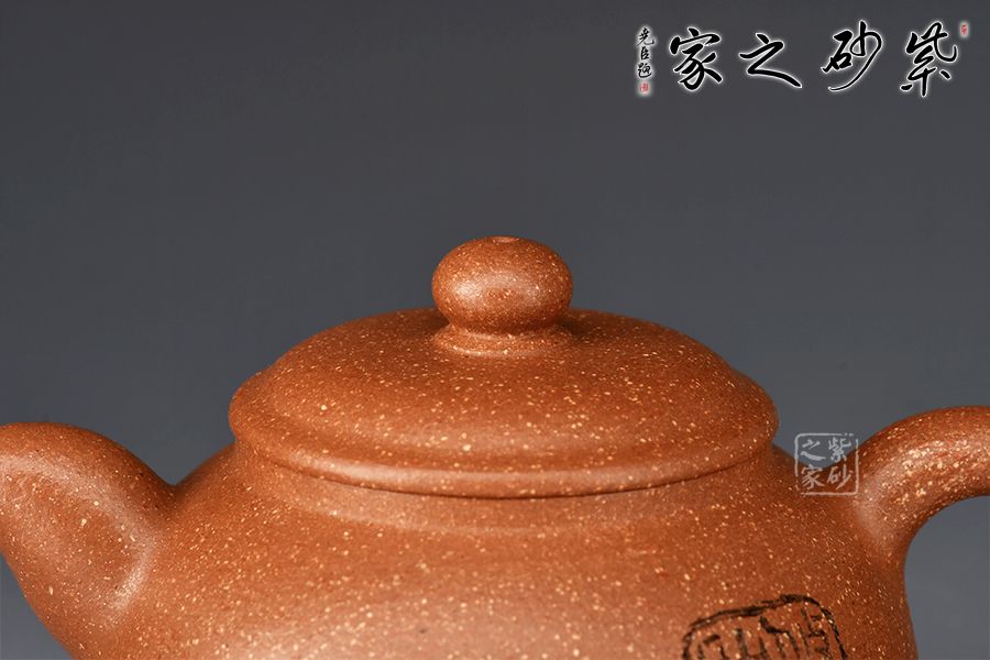 整個壺型敦厚、端莊,飽滿圓潤;壓蓋式設(shè)計,緊密貼合;壺鈕如珠,璀璨奪目;短粗彎流壺嘴,可愛上翹,出水爽利;端把較大,圓潤渾厚,和壺嘴形成鮮明的對比。