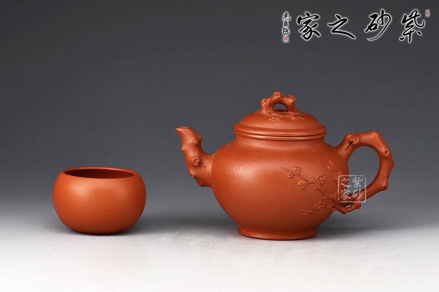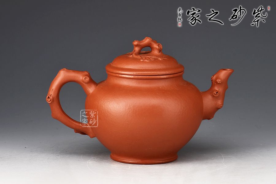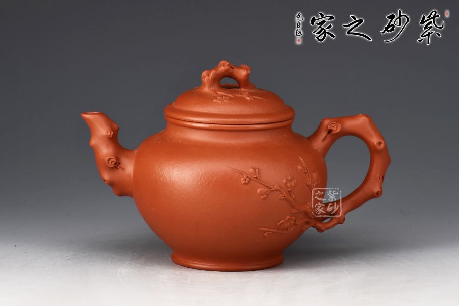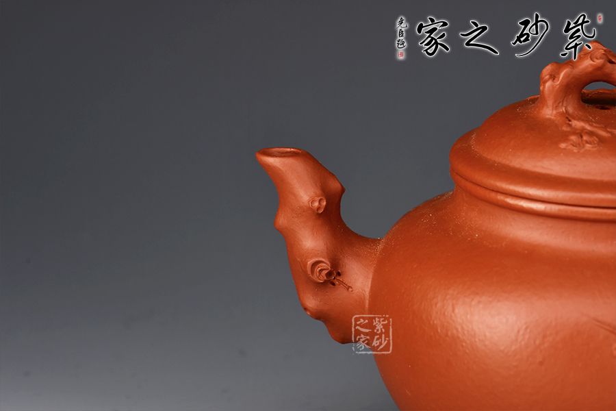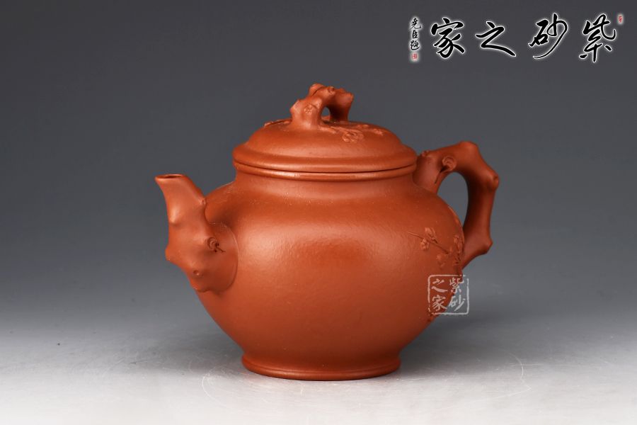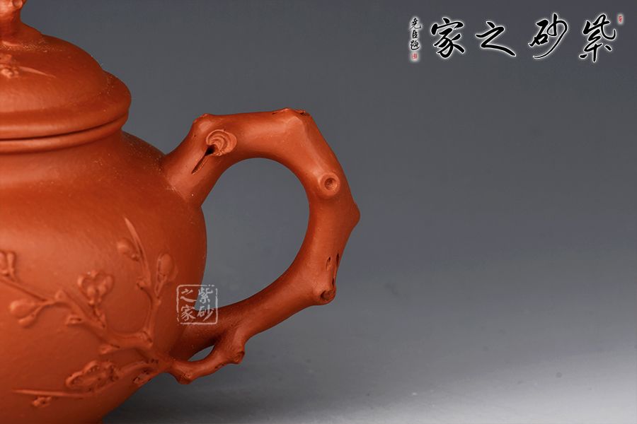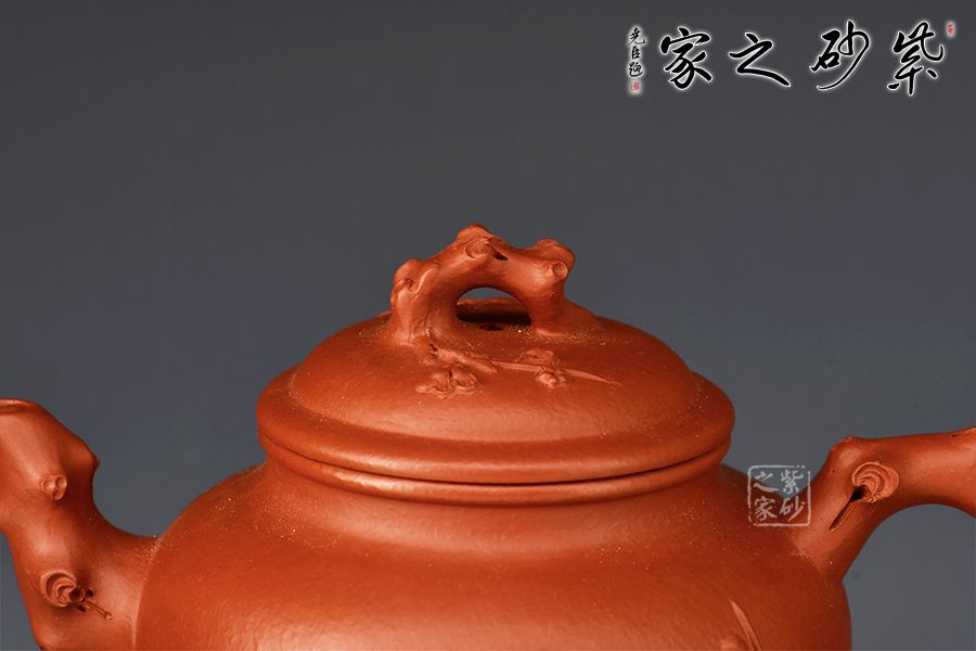 報(bào)春壺是紫砂經(jīng)典器型之一,造型以笑櫻壺為基礎(chǔ),以梅入題,壺腹圓潤(rùn)飽滿,橋鈕、彎流、耳把如梅枝自然胥出,蜿蜒而行,塑就優(yōu)雅姿態(tài)。蓋面、壺面貼塑裝飾精巧,梅花朵朵綻放,生機(jī)盎然。整器比例敲到好處,線條流暢柔和,雅致之中見(jiàn)精湛工藝,氣韻充沛,欣賞、把玩、使用俱佳。