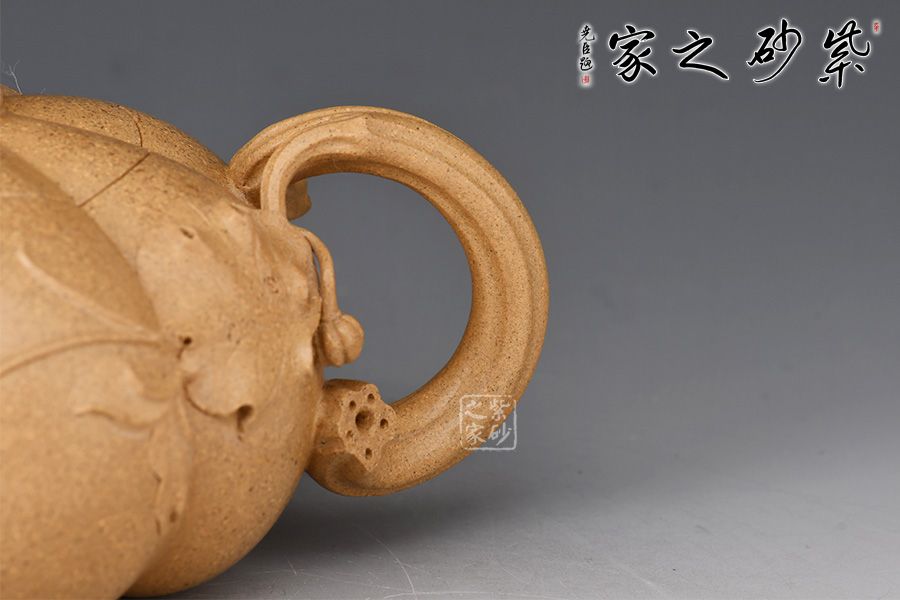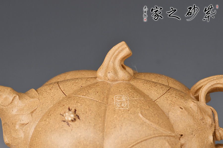 此壺以瓜柄為壺蓋,瓜藤為壺把,葉脈藤紋貼繪逼真,構思取材自然,達以和諧巧妙的境界,,雅而不俗。此壺壺身分為六瓣,肌理鼓出,飽滿瑩潤,形態(tài)逼真。壺鈕、壺把皆以南瓜藤為原型,壺嘴則若南瓜葉包裹而成,整壺仿若一只生動形象的南瓜!