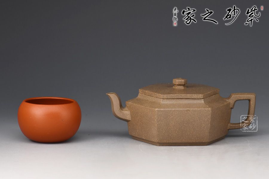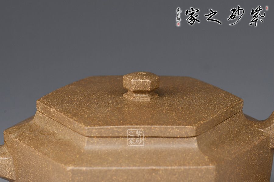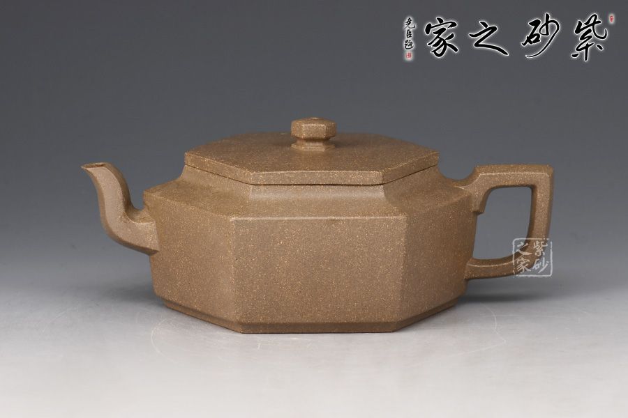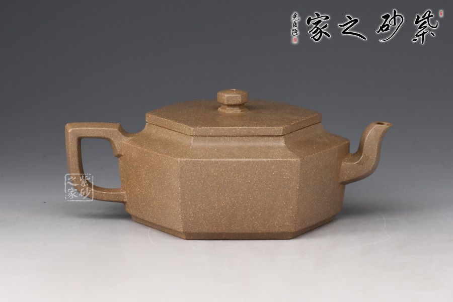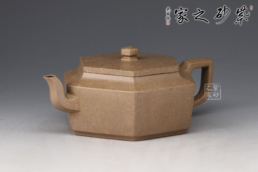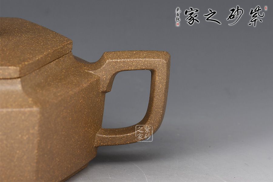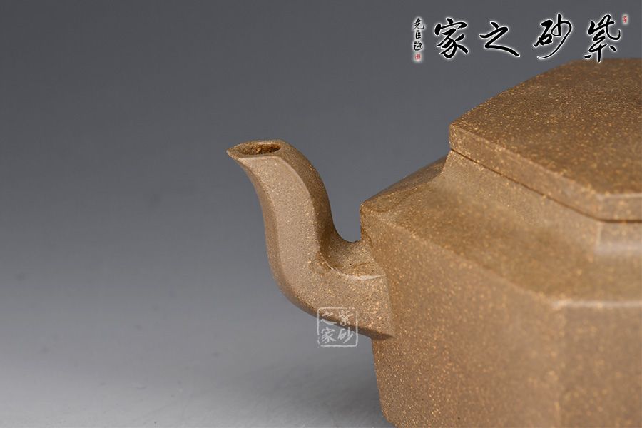 此壺精選青灰泥作胎,泥色明潤雅麗。整壺以六方為型,壺身呈六棱柱型,身筒高挺端正。鈕、蓋與壺體之形相稱,六方線條層層相迭。流、把以棱線飾之,線面之間挺括平整,彎流高高昂起,造型優(yōu)雅,大耳把氣宇軒揚,把握舒適。