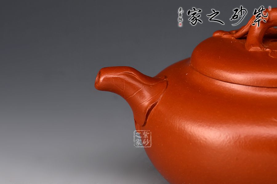 此壺壺身呈扁圓形制,嵌蓋頂端配以葫蘆枝形鈕,新生有嫩葉小果,自然散開,栩栩如生。葉子包裹著壺嘴,一彎嘴出水爽利,以藤蔓為圈把,壺把處胥出枝葉、果實于壺身、靈動唯美,頗具自然氣息。