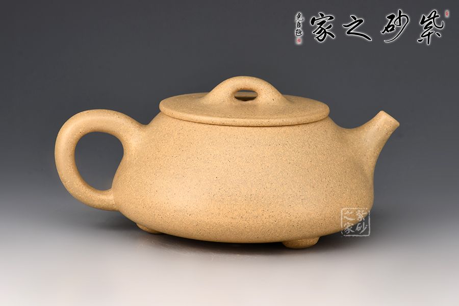此壺取景舟石瓢之型,以原礦青段作胎,泥色清麗雅致,粒粒砂感盡顯古拙樸雅之味。壺身呈八字造型,豐潤(rùn)飽滿(mǎn),曲線柔和流暢,平壓蓋、橋鈕,拿取自如,流、把相互映襯,直流簡(jiǎn)而有力,出水順暢,壺把優(yōu)雅揚(yáng)起,提攜舒適。加之底部三乳足,給人以輕靈而穩(wěn)重之感。