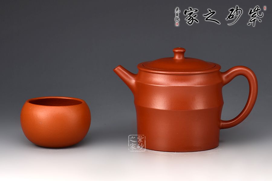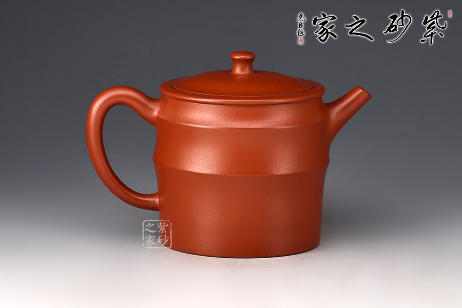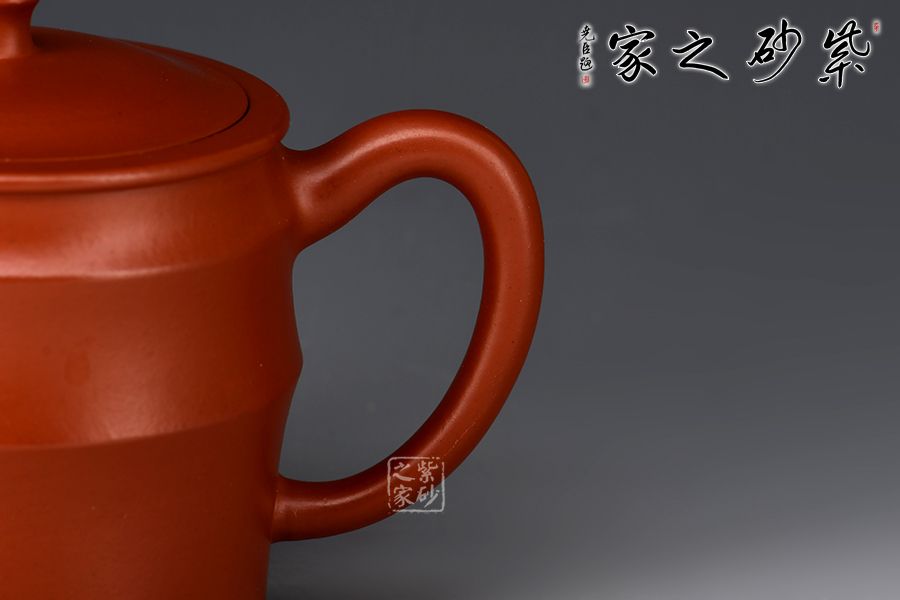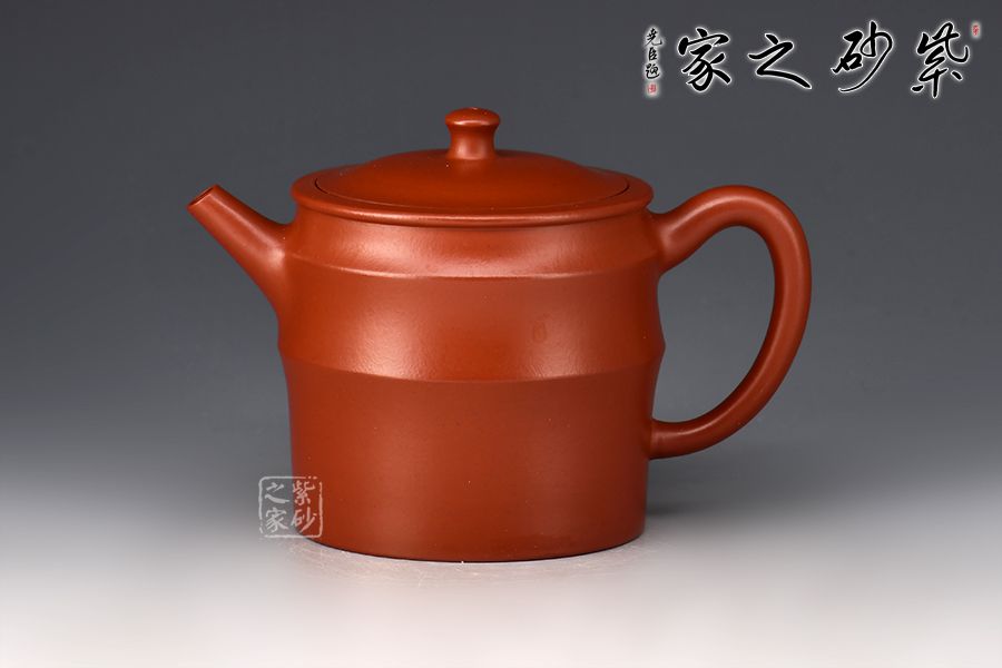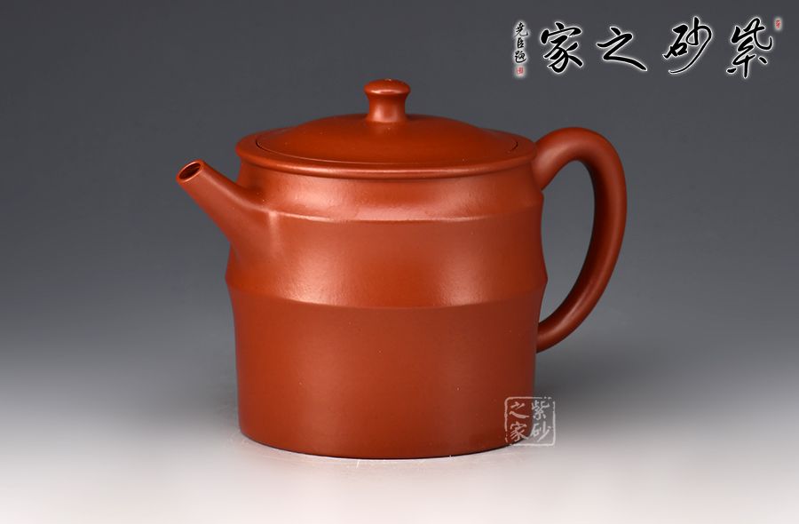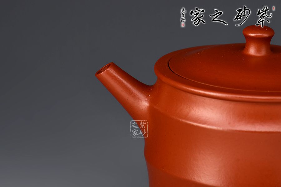 亦柔壺精選原礦大紅袍為胎,成色明潤,嬌艷動(dòng)人,觸之細(xì)膩,手感極佳。湯宣武全手工制作,范澤鋒大師監(jiān)制。壺身筒式,仿三節(jié)竹段之形而制,三節(jié)竹段長度不等,竹節(jié)凸起,似凸弦紋,增加了壺體的裝飾性。嵌蓋嚴(yán)絲合縫,柱形壺鈕小巧可愛。直嘴出水爽利,耳把拿捏舒適。