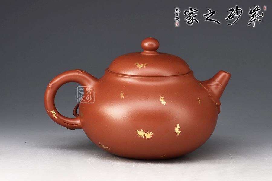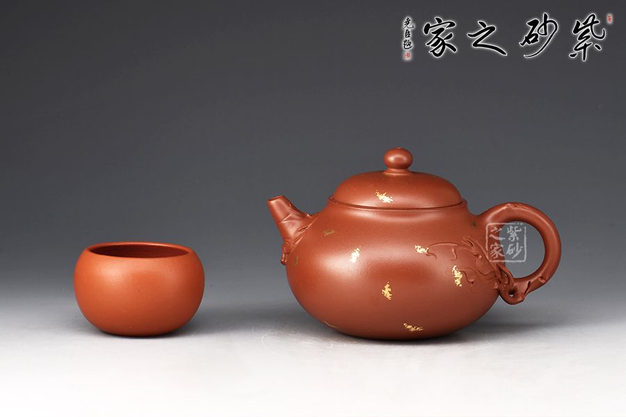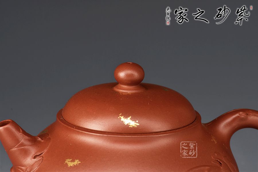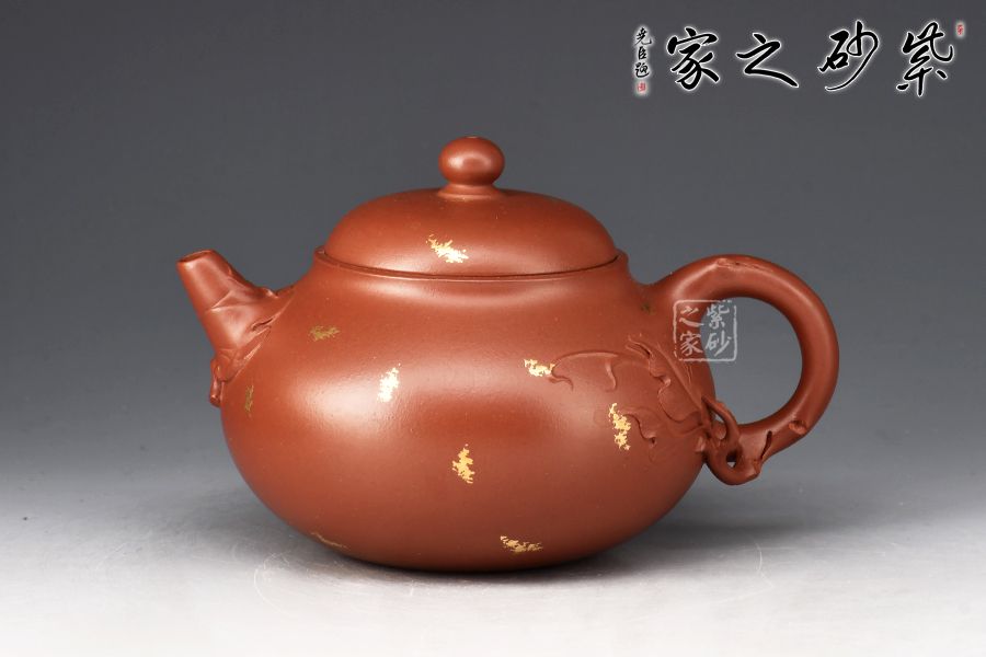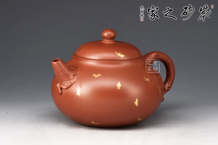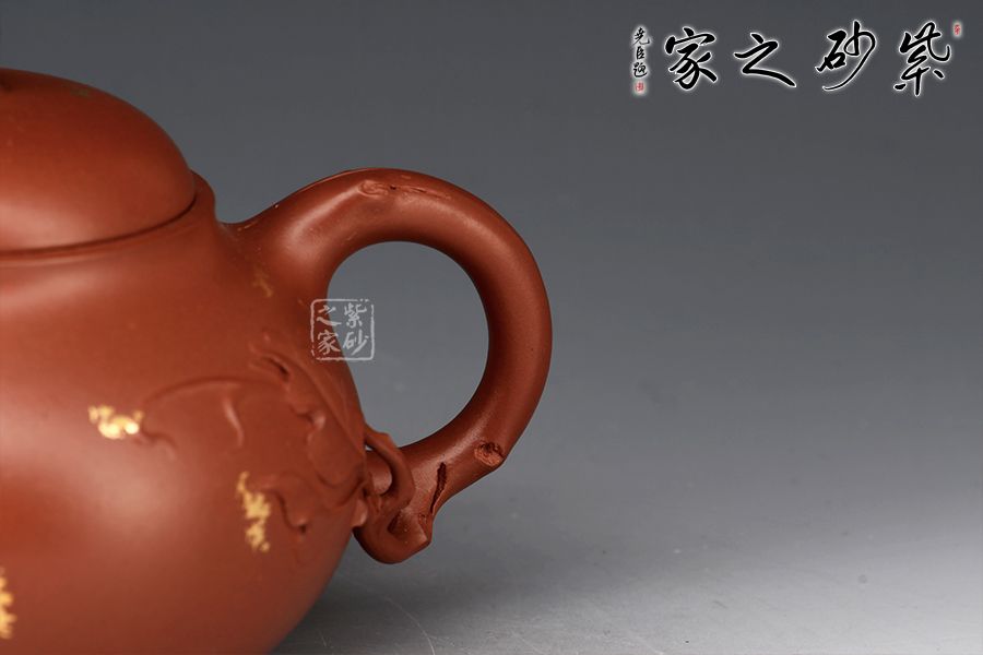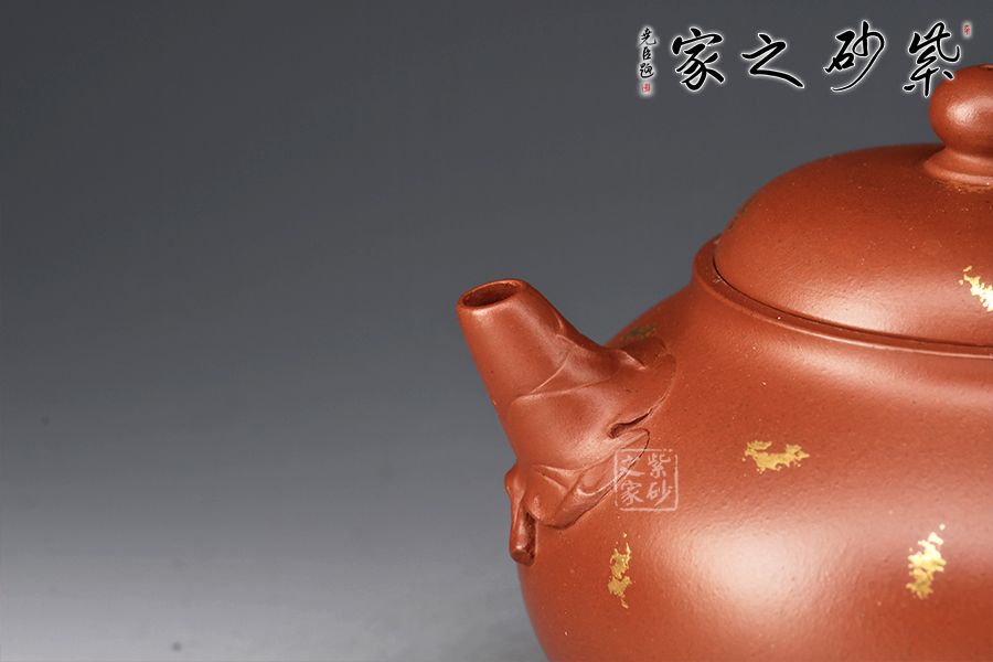 此壺為作選用原礦底槽清精制而成,色澤溫潤怡人,造型優(yōu)雅,富含美感。整壺由范澤鋒大師監(jiān)制,湯先武老師制作,壺腹飽滿,上下收斂,嵌蓋穹起,珠鈕與壺身之形相互呼應(yīng)。葉片卷裹成嘴,把若枝干胥出,底部枝葉蔓延至壺面,刻畫細(xì)膩,充滿生機(jī)。作者以戧金工藝見長,于壺面裝飾朵朵金花、粒粒圓點(diǎn),寓意枝繁葉茂,花開爛漫,極盡優(yōu)美,乃藝術(shù)性與實(shí)用性兼具的一款紫砂壺佳作,值得入手。