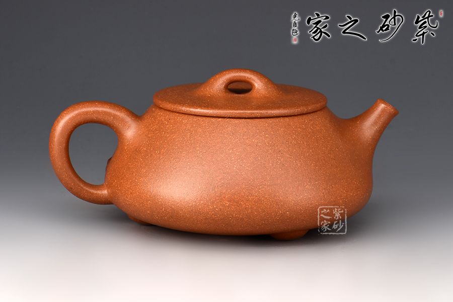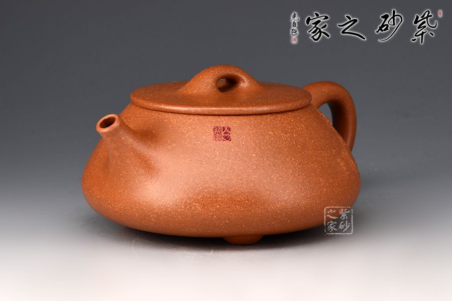 此壺取景舟石瓢之型,以降坡泥作胎,泥色古樸,粒粒砂感盡顯古拙樸雅之味。壺身呈八字造型,豐潤飽滿,曲線柔和流暢,平壓蓋、橋鈕,拿取自如,流、把相互映襯,直流簡而有力,出水順暢,壺把優(yōu)雅揚(yáng)起,提攜舒適。加之底部三乳足,給人以輕靈而穩(wěn)重之感。