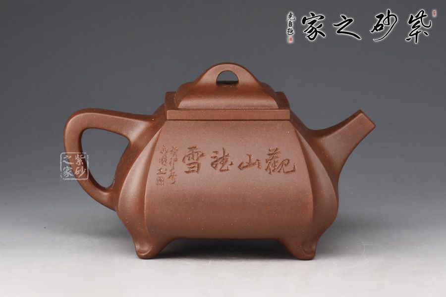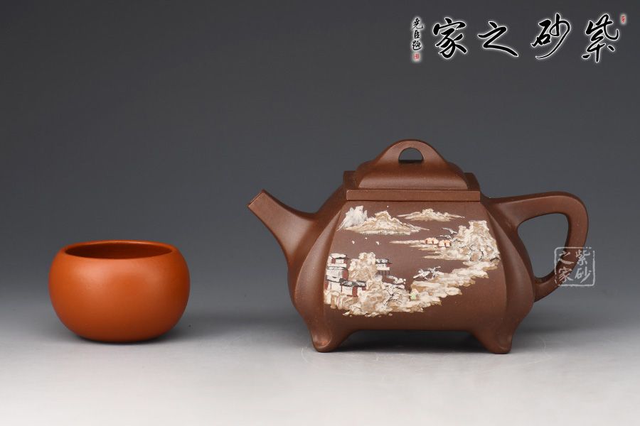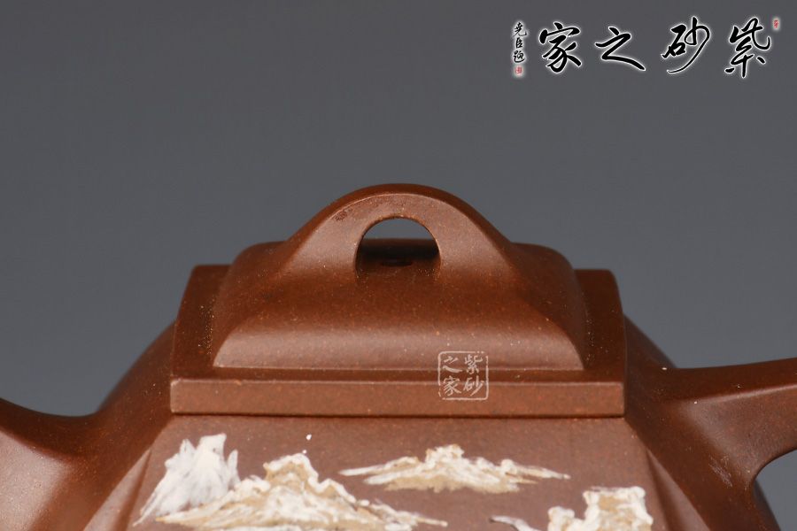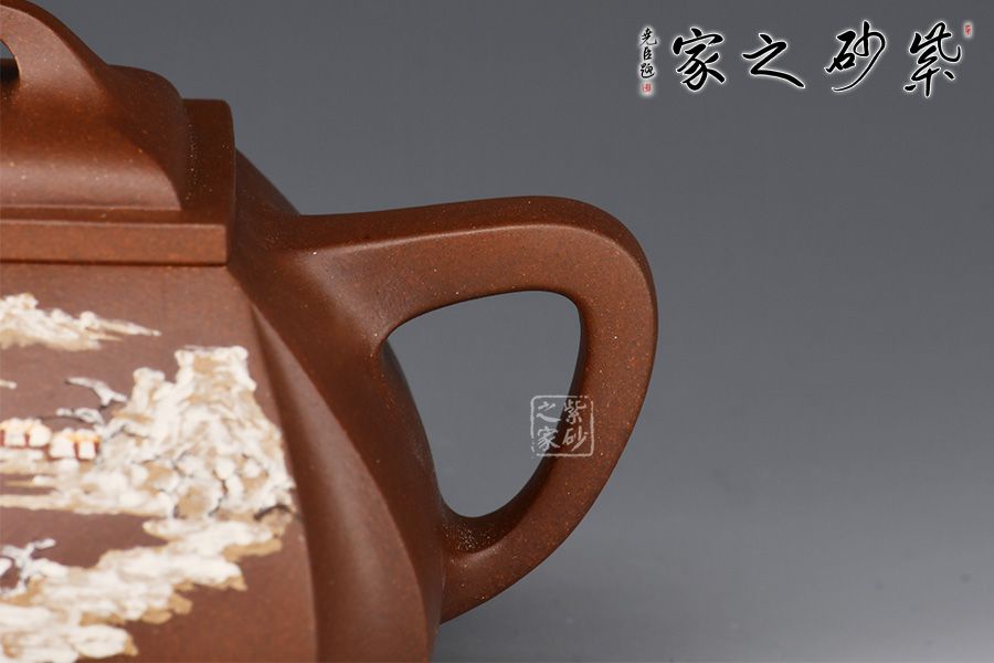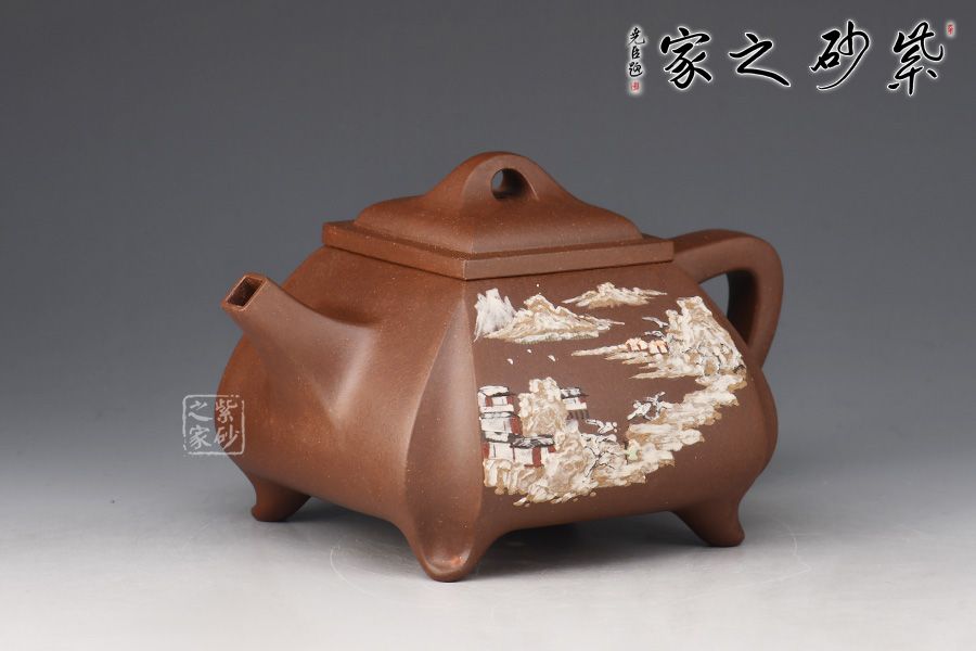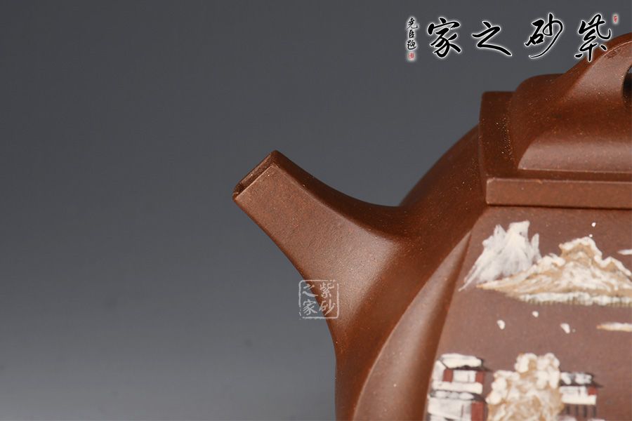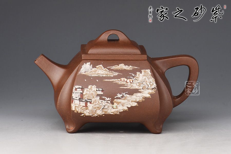 四方抽角石瓢由石瓢改良而來(lái),所謂方非一式,圓不相一,此款器型便是更好的詮釋了方與圓的完美藝術(shù),作品剛?cè)嵯酀?jì),有方器的剛正挺直,也有圓器的順暢和柔和。石瓢上儉下豐的特點(diǎn),四方規(guī)整的優(yōu)勢(shì),互相結(jié)合,四角抽角設(shè)計(jì)不顯突兀,剛?cè)嵯酀?jì),使得整個(gè)壺體端莊、深厚。壺蓋、壺嘴、壺把皆可為方,四方造型貫徹整壺,橋形鈕也采用四方形制,而拱橋又方中見(jiàn)圓。器剛正不阿、棱角分明,器形渾厚,線條流暢,四個(gè)釘足提升整體氣勢(shì)。泥繪裝飾,工藝精湛,畫(huà)面精美。