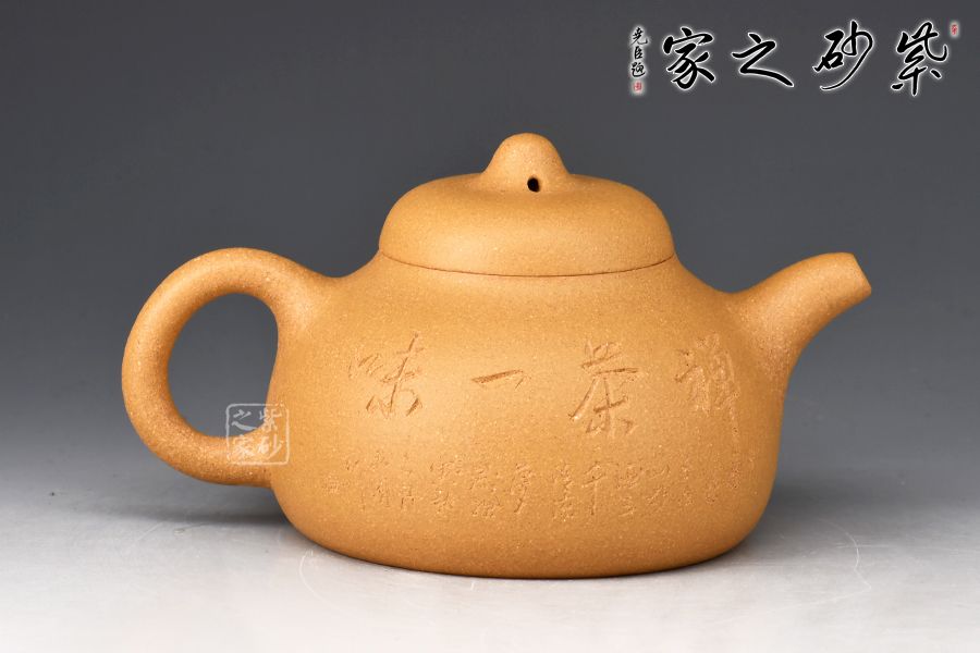 此件乳丁壺,器身微扁,氣韻圓融,壺蓋鼓出,扁鈕蘊(yùn)力,圓錐壺流胥出自然,出水爽利,耳形壺把簡(jiǎn)潔利落。