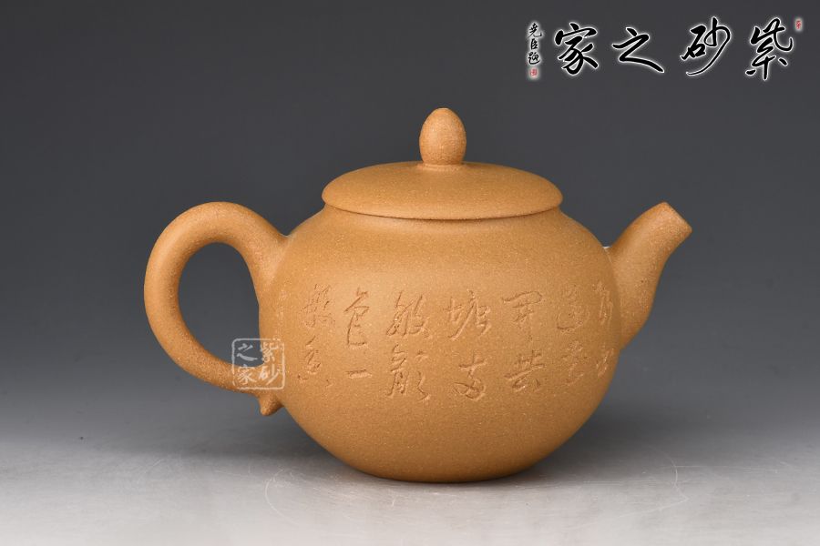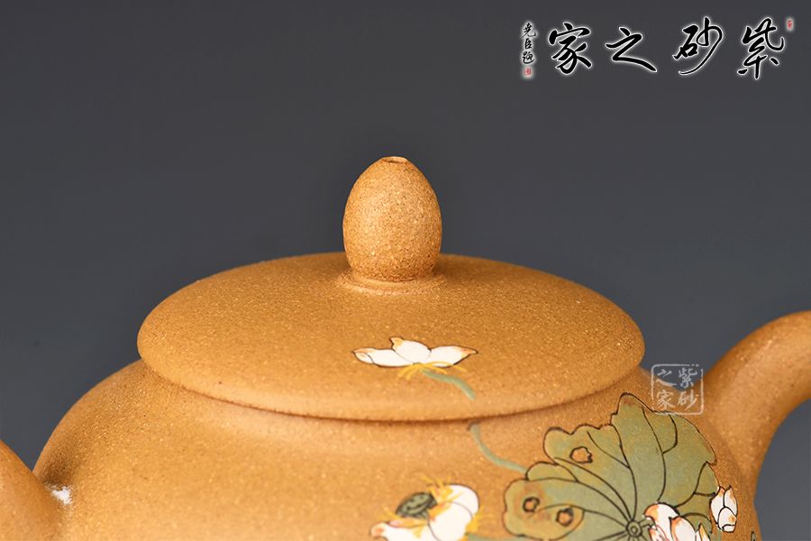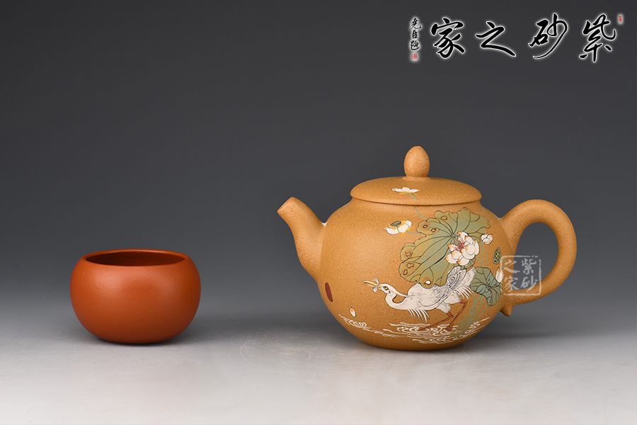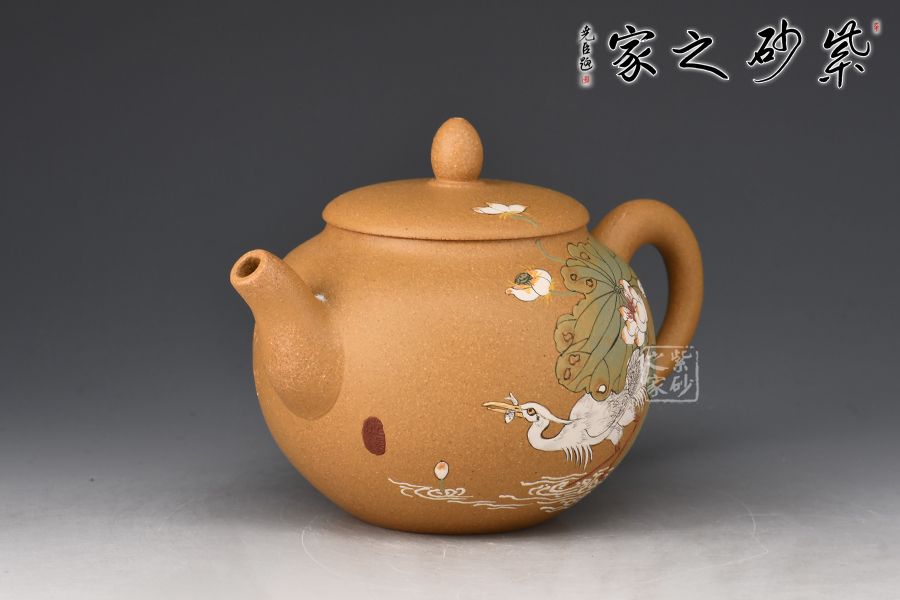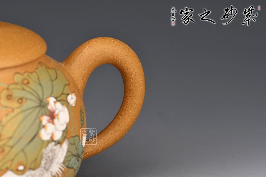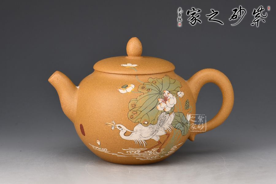 270cc壺體處處顯圓,豐碩飽滿(mǎn),氣韻充沛。圓蓋、水滴鈕精巧可愛(ài),流把胥出自然,手法細(xì)膩。壺身正面泥繪仙鶴捕魚(yú)圖,荷花、荷葉、水波紋點(diǎn)綴其間,描畫(huà)入微,增添無(wú)限動(dòng)感。反面陶刻古詩(shī)詞,刀下見(jiàn)神韻,文人風(fēng)骨生!