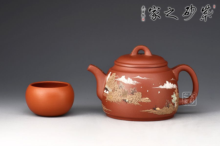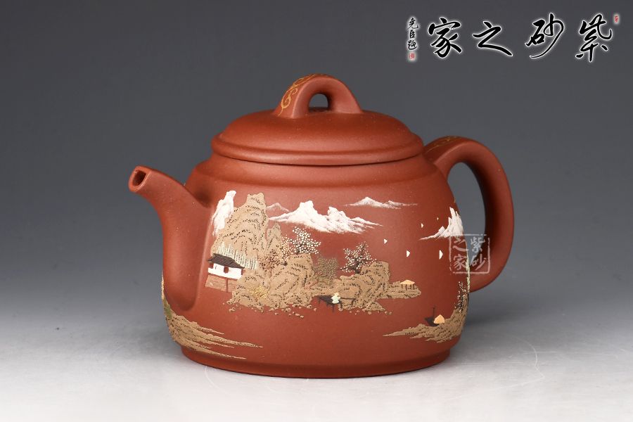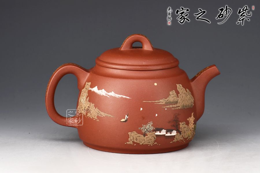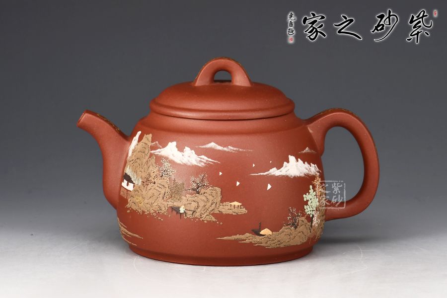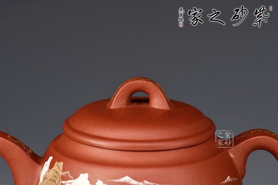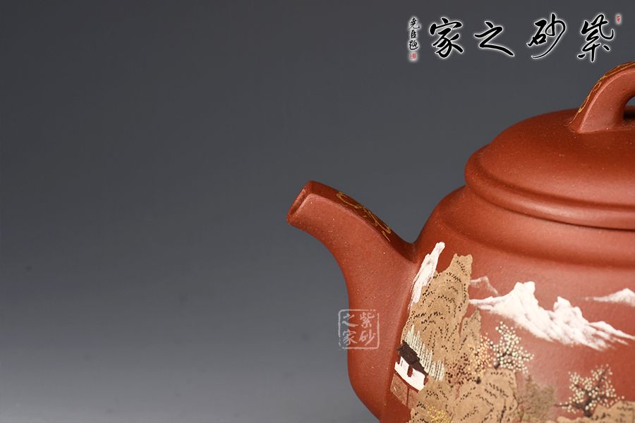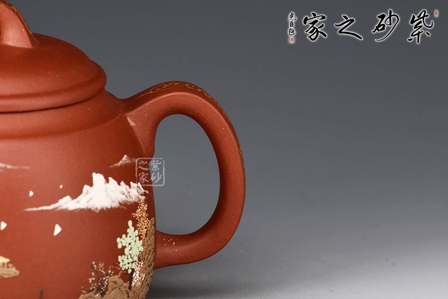 運用原礦清水泥作胎,泥色紫中泛紅,胎質(zhì)細膩,典雅溫潤。顧名思義,身呈佛鐘造型,端莊穩(wěn)重。三彎嘴出水爽利,耳把拿捏舒適。壺腹泥繪江南山水,令人癡迷,流連忘返。