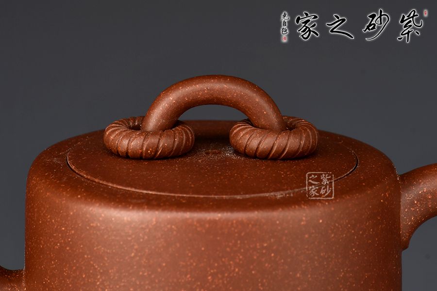 此件為作者全手摹古顧景舟大師雙圈,在其基礎(chǔ)上縮小比例,以原礦紫泥作胎,色澤溫潤(rùn),顆粒感盡顯古樸韻味。圓柱形身筒簡(jiǎn)約典雅,壺肩線條柔順,平肩嵌蓋,橋鈕套以雙環(huán),環(huán)上雕塑螺旋紋,古雅靈動(dòng)。三彎流胥出挺秀,大耳把方圓有度。整壺樸雅端莊,比例協(xié)調(diào),走線流暢,富有律動(dòng)感,390cc實(shí)用內(nèi)斂,值得品賞。