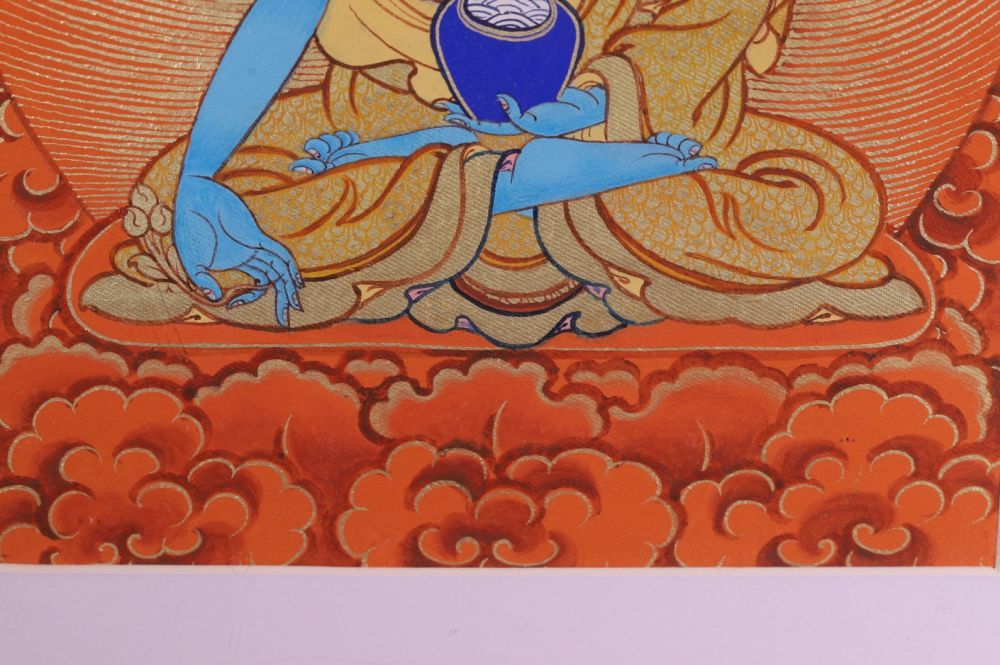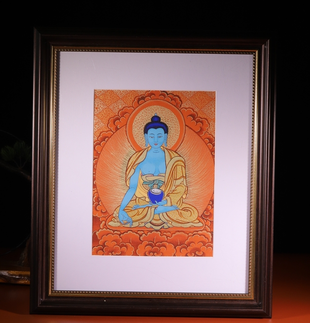 產(chǎn)地:熱貢 工藝: 創(chuàng)作年份: 題材:藥師佛 繪制時間:2月 尺寸:*30*25cm 裝裱:鏡片 材質(zhì):藏綿布 使用場地:走廊