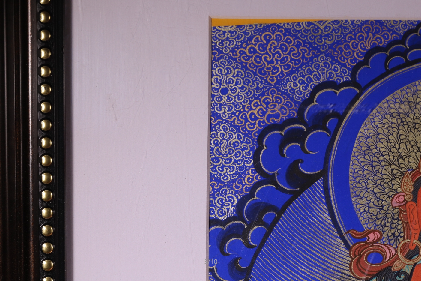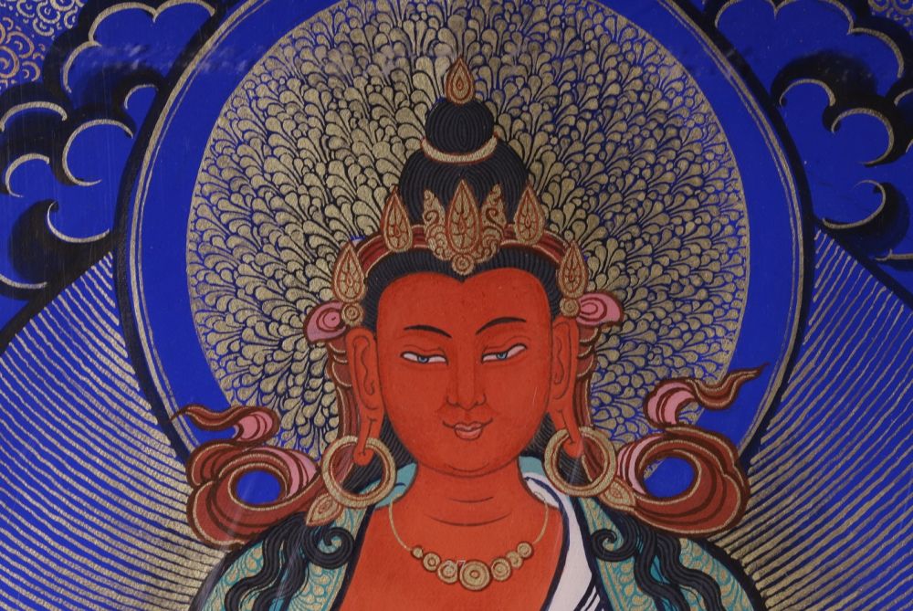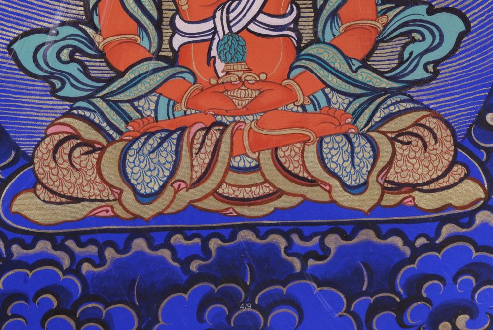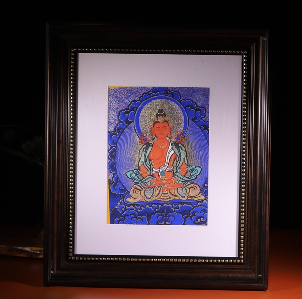 產(chǎn)地:熱貢 工藝: 創(chuàng)作年份:2022 題材:長(zhǎng)壽佛 繪制時(shí)間:1月 尺寸:*30*25cm 裝裱:鏡片 材質(zhì):藏綿布 使用場(chǎng)地:走廊