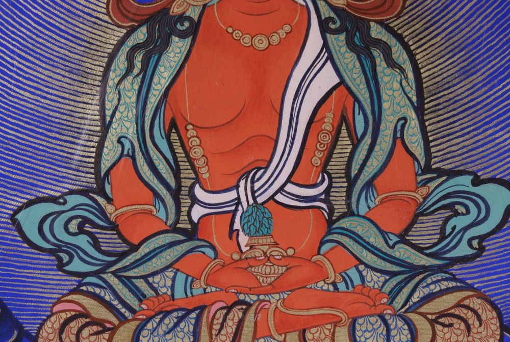 藏傳佛教中其畫像為一面二臂,肌膚紅色,盤發(fā)成髻戴五佛寶冠,上穿天衣,下著綢裙,身佩珍寶瓔珞,具足一切報(bào)身佛的種種莊嚴(yán),雙手結(jié)禪定印于膝上,托長(zhǎng)壽寶瓶,雙足以金剛雙跏趺安住于蓮花月輪上。