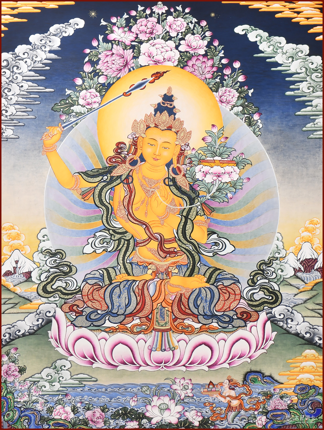文殊菩薩為諸佛、諸菩薩之師,是大智慧的象征,智慧無(wú)雙,有開(kāi)悟明智的加持力。通常手持慧劍,騎乘獅子,比喻以智慧利劍斬?cái)酂?,以獅吼威風(fēng)震懾魔怨。