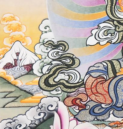 該作品在表現(xiàn)形式及構(gòu)圖和設(shè)色上吸收了漢地工筆畫(huà)的畫(huà)風(fēng),與藏傳繪畫(huà)藝術(shù)兼容并蓄,在傳統(tǒng)上加進(jìn)自己對(duì)繪畫(huà)和佛教的理解來(lái)創(chuàng)作,意境遼遠(yuǎn)。線(xiàn)條的繪制手法精湛,細(xì)致而不纖弱,流暢舒緩。