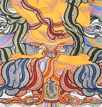 在繪制佛像服飾等位置時(shí),用刻金技法,使圖案更具豐富的層次和立體感,用金勾勒的線(xiàn)條和圖案不但明亮度進(jìn)一步提高,讓畫(huà)面更加燦爛,而且也使金在畫(huà)面上保持得更加長(zhǎng)久。