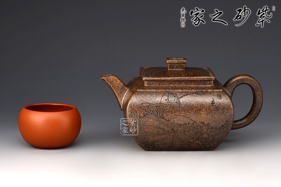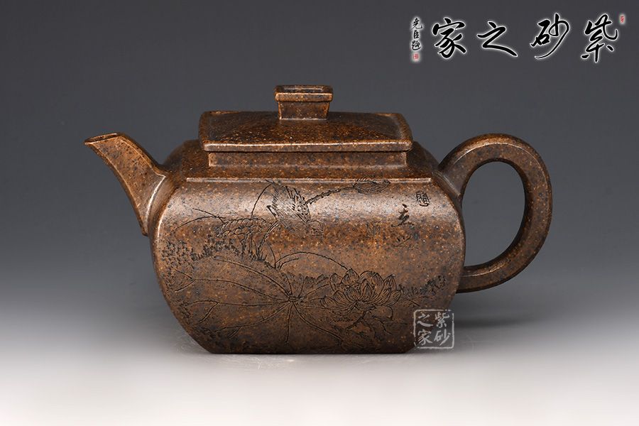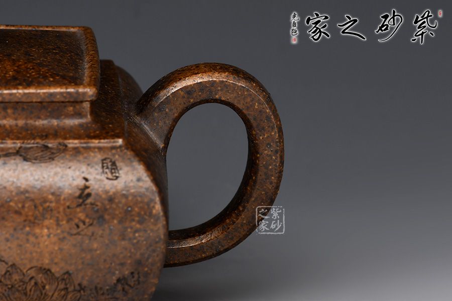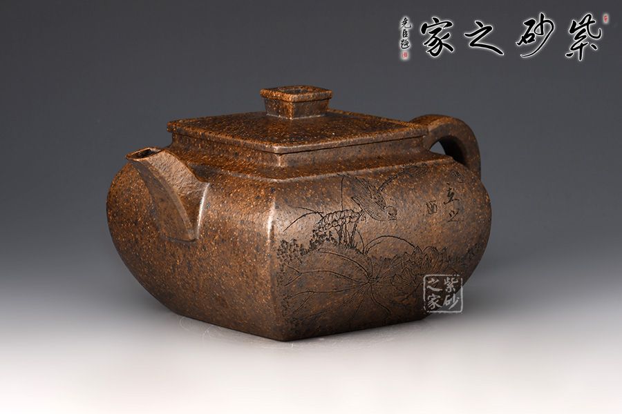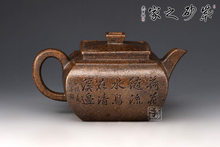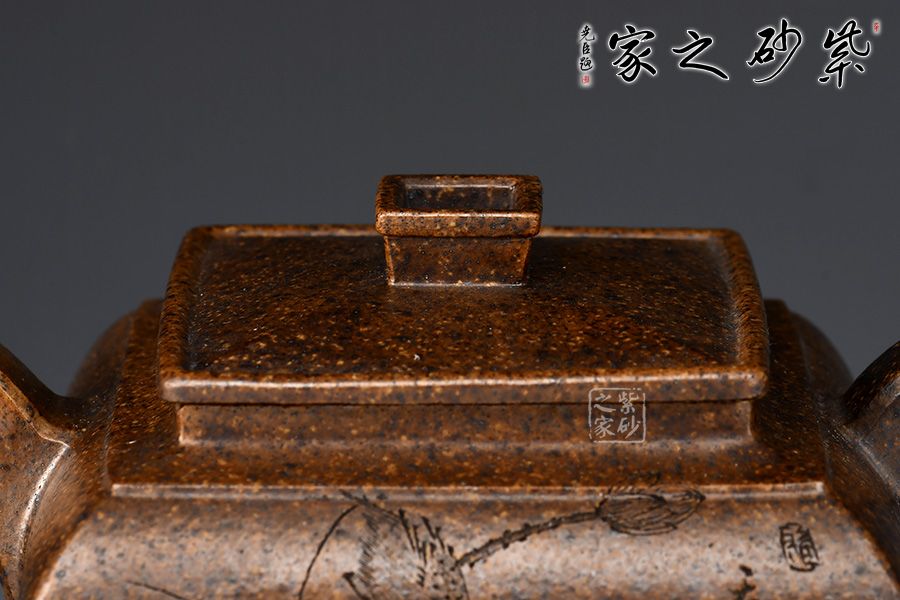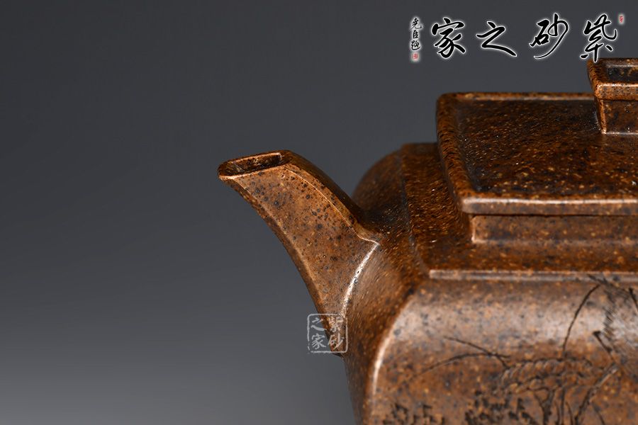 四方壺身骨肉亭勻,曲線強勁有力。方蓋、方鈕、方頸層層遞進,抽角裝飾更顯典雅。流、把,左右均衡,比例協(xié)調(diào),形體舒展流暢。
