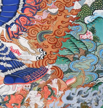該作品在表現(xiàn)形式及構(gòu)圖和設(shè)色上吸收了漢地工筆畫的畫風(fēng),與藏傳繪畫藝術(shù)兼容并蓄,在傳統(tǒng)上加進(jìn)自己對(duì)繪畫和佛教的理解來創(chuàng)作,意境遼遠(yuǎn)。線條的繪制手法精湛,細(xì)致而不纖弱,流暢舒緩。