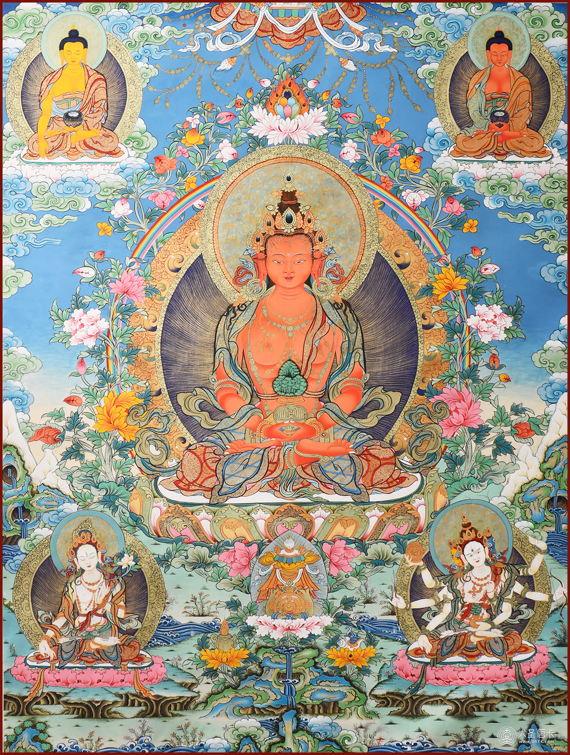 藏傳佛教中其畫像為一面二臂,肌膚紅色,盤發(fā)成髻戴五佛寶冠,上穿天衣,下著綢裙,身佩珍寶瓔珞,具足一切報(bào)身佛的種種莊嚴(yán),雙手結(jié)禪定印于膝上,托長(zhǎng)壽寶瓶,雙足以金剛雙跏趺安住于蓮花月輪上。