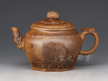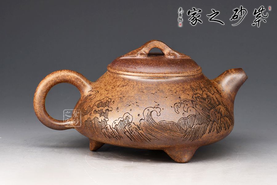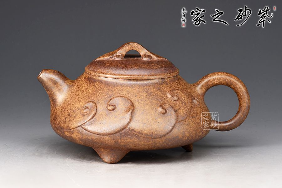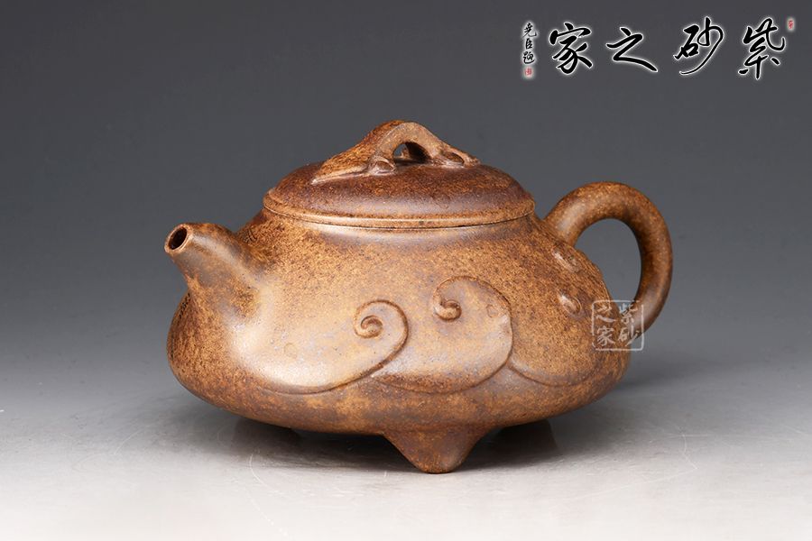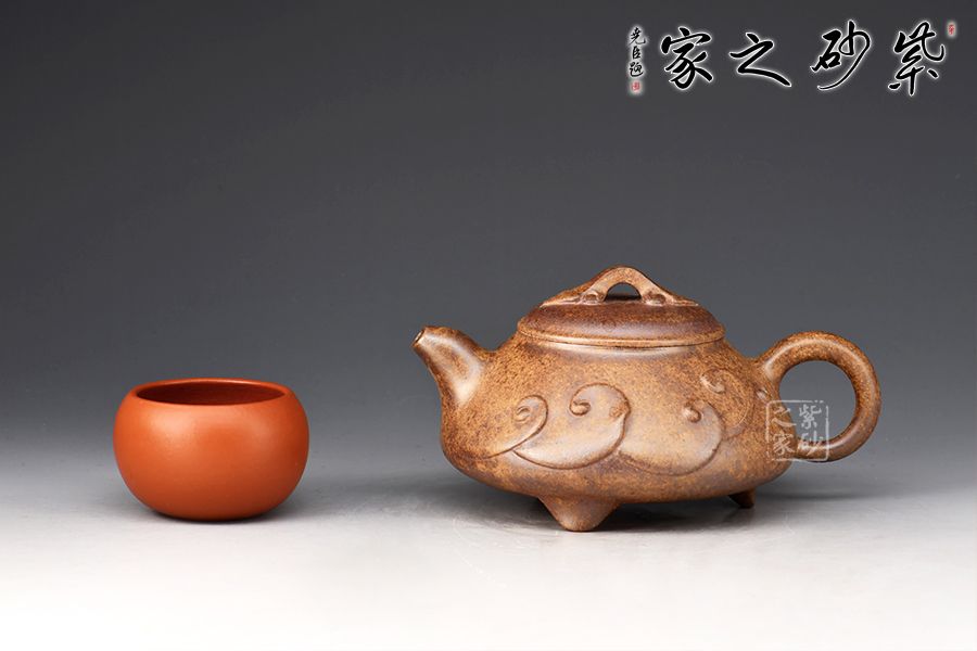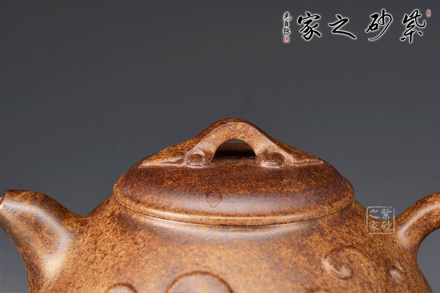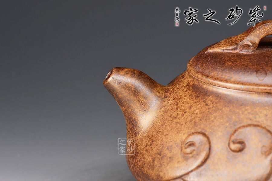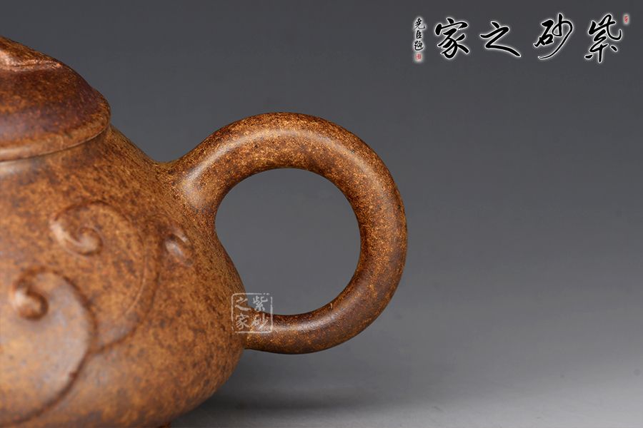 赤龍煥彩,采用家藏大紅袍朱泥底料結(jié)合極其珍貴黃金段料研磨成顆粒,請教原紫砂廠練泥車間老師傅,進行多次配比實驗,燒成后黃金段顆粒自然排列有如龍之金鱗,融合的大紅袍朱泥特性,故名赤龍煥彩。