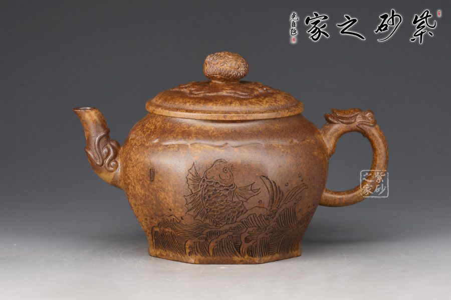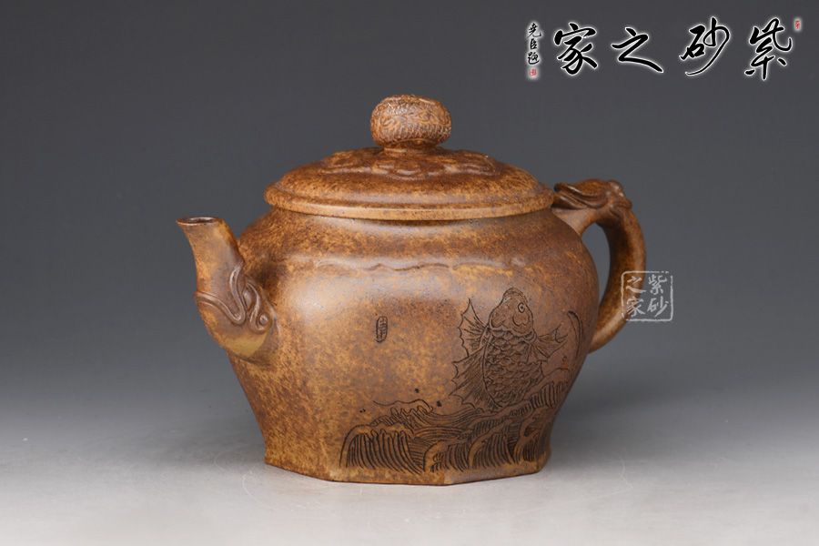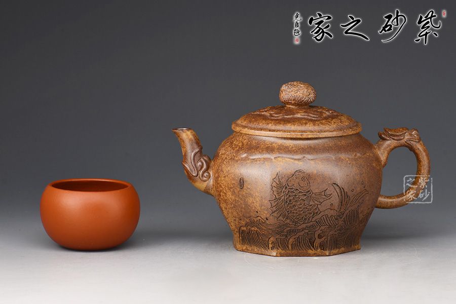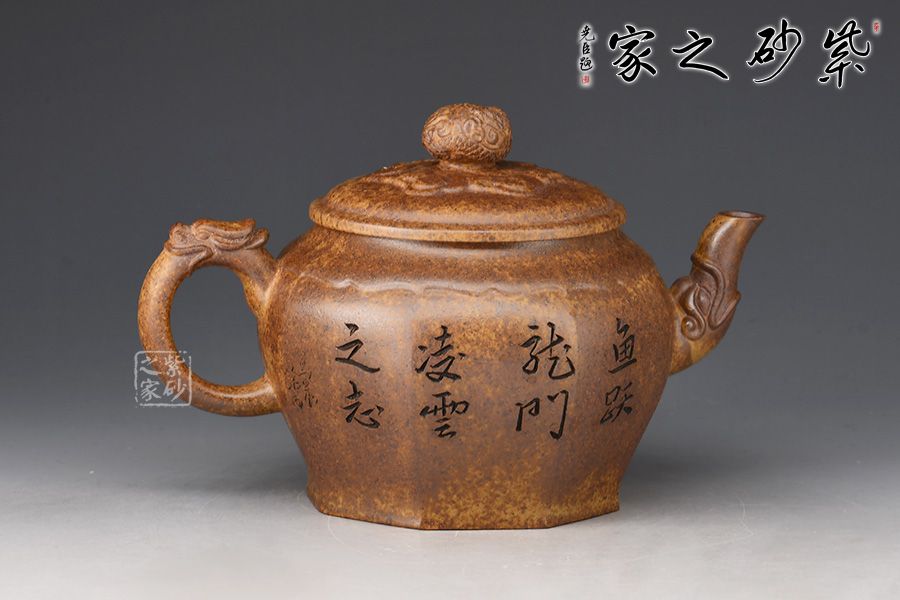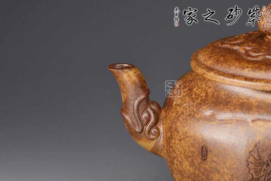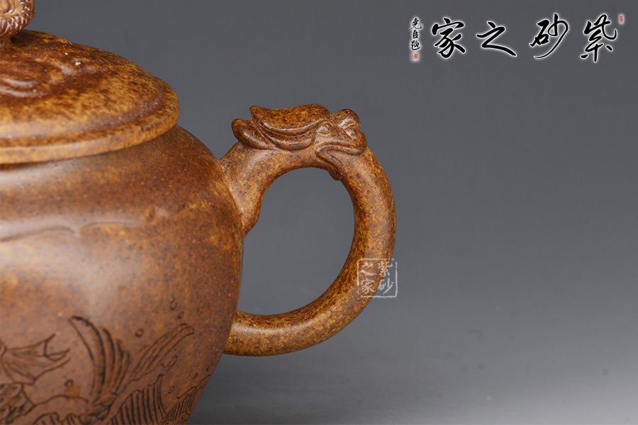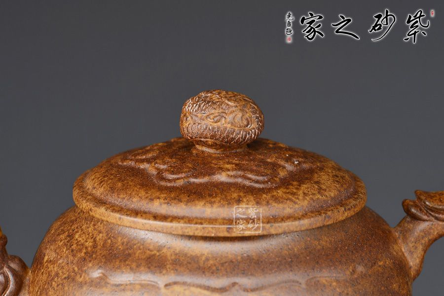 赤龍煥彩,采用家藏大紅袍朱泥底料結(jié)合極其珍貴黃金段料研磨成顆粒,請(qǐng)教原紫砂廠練泥車間老師傅,進(jìn)行多次配比實(shí)驗(yàn),燒成后黃金段顆粒自然排列有如龍之金鱗,融合的大紅袍朱泥特性,故名赤龍煥彩。