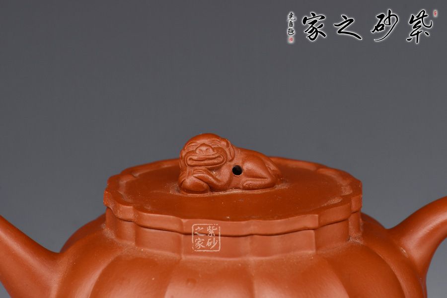 獅球壺為流傳于清代的傳統(tǒng)壺式,此壺將傳統(tǒng)獅球壺與筋紋器相結(jié)合,以大紅袍作胎,成色瑩潤。壺身渾圓,以筋囊線條裝飾,每一瓣都飽滿均勻,曲張有致。壓蓋之上,塑一臥獅作壺鈕,與壺身合為“獅子戲球”之意。直流嘴挺拔上翹,出水有力,耳把均勢而起,簡約大氣,與壺嘴形成和諧之美。整壺線條流暢,做工精良,氣韻雄渾,寓傳統(tǒng)文化于其中,表以吉祥寓意,自用饋贈兩相宜。