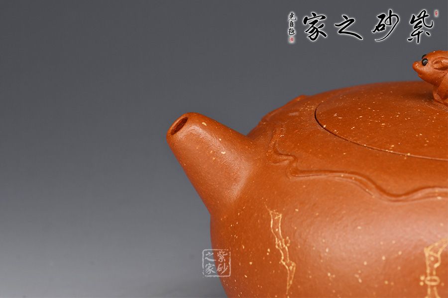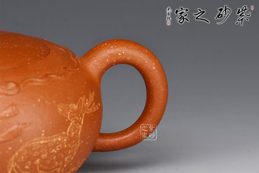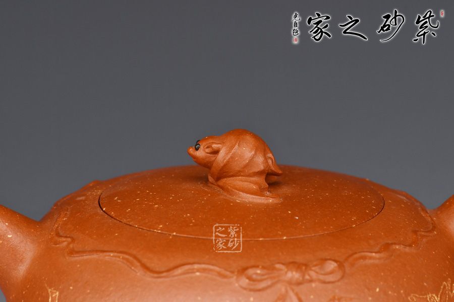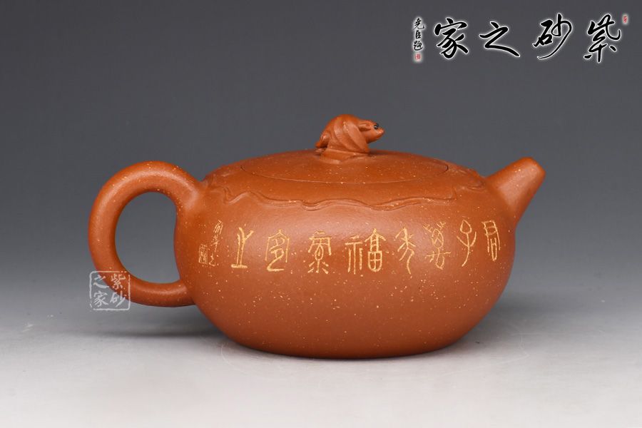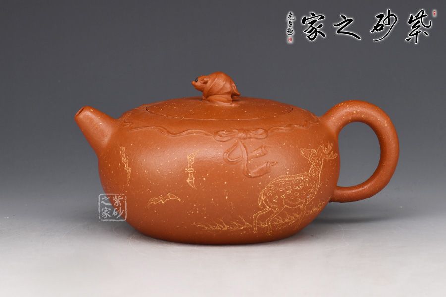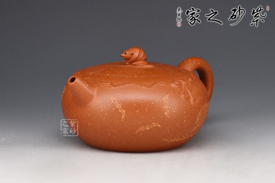 此款延年益壽壺,壺身扁圓,造型端莊,采用朱砂泥手制,砂粒凸顯,富有質感。直流短嘴挺翹而出,耳形把抓握舒適,壺鈕為一只蝙蝠,寓意長壽萬年,壺身刻繪:君子萬年福康安之,刀法剛勁有力,風骨畢露,彰顯文人魅力;此款作品看似簡單,費時費力,幾易其稿,最終成形,品茗把玩再好不過,收藏升值!