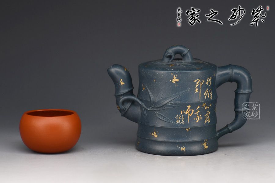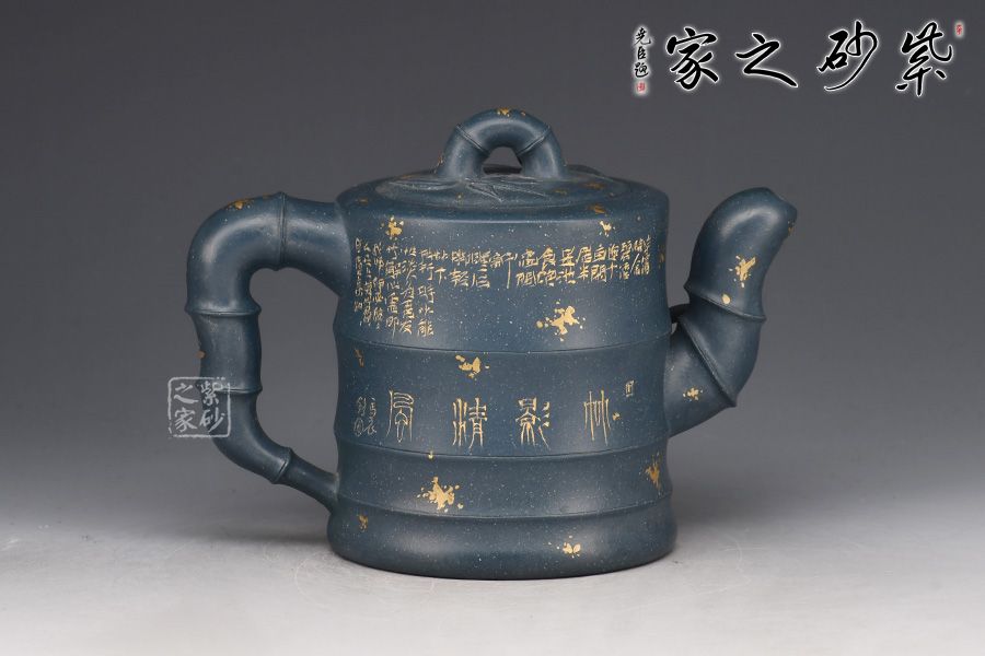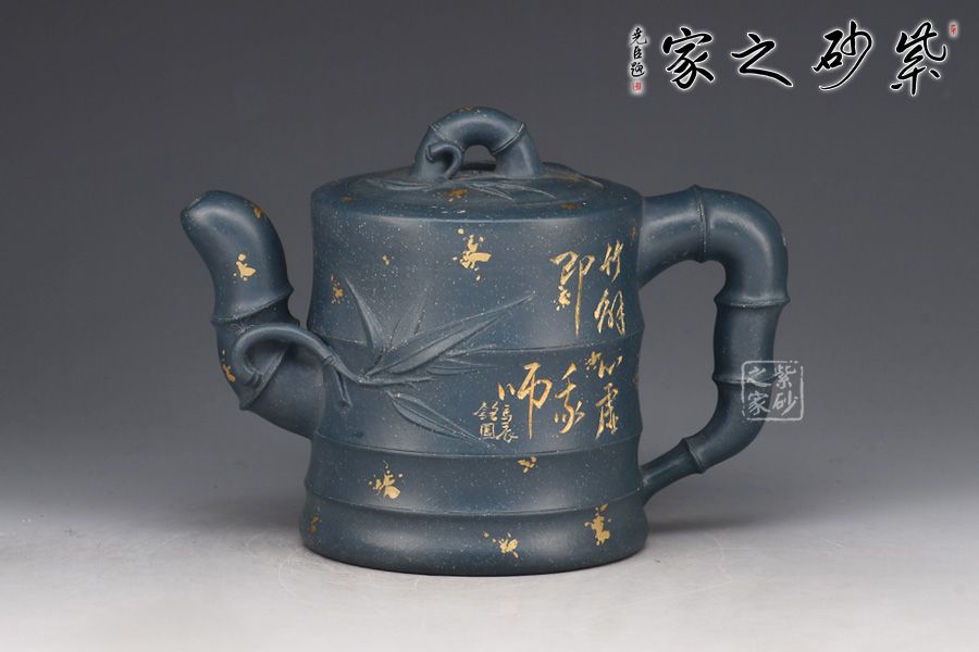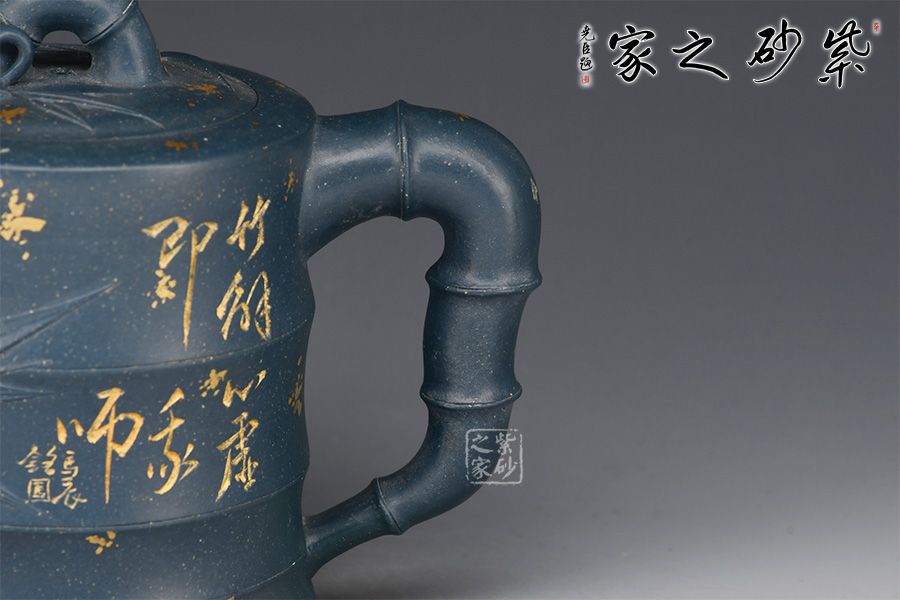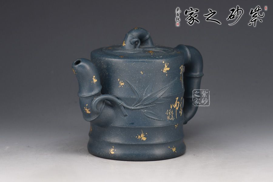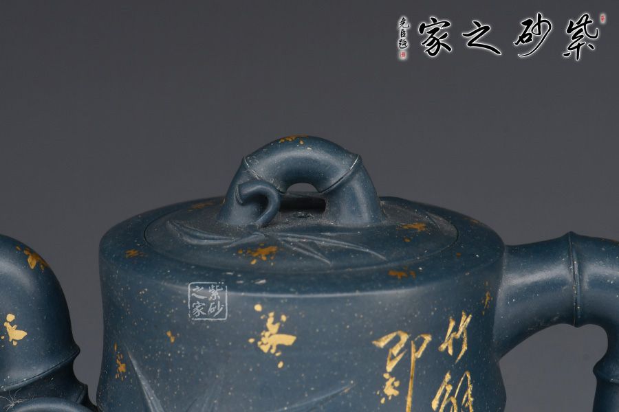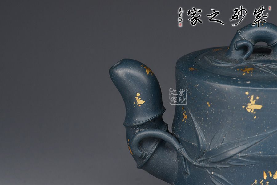 此款《竹報平安》壺,采用蘇門答臘青泥料制成,泥色典雅。壺體簡潔端莊,大方爽利??v觀此壺,壺身、壺嘴、壺流以及壺把,皆為竹節(jié)裝飾,壺身和壺蓋處的貼花體現(xiàn)作者深厚的制壺功底。壺身的撒金工藝加刻繪,為此壺錦上添花,更顯氣韻充沛。