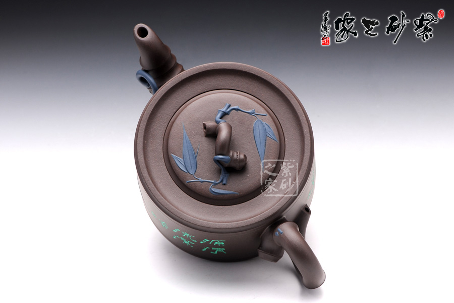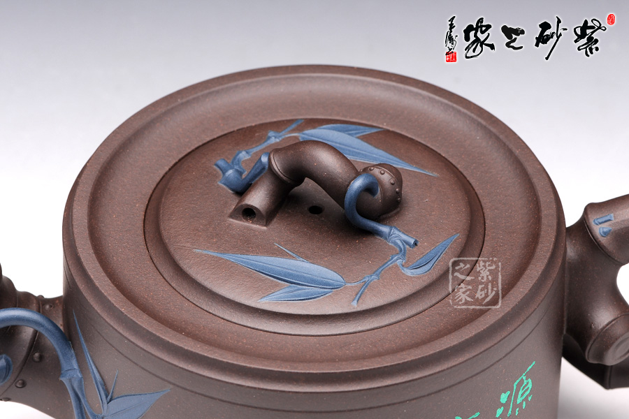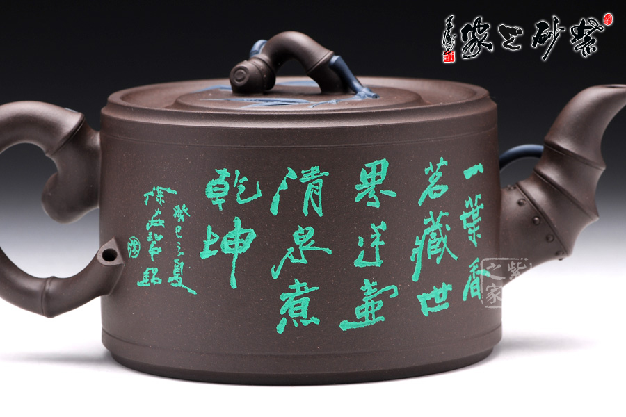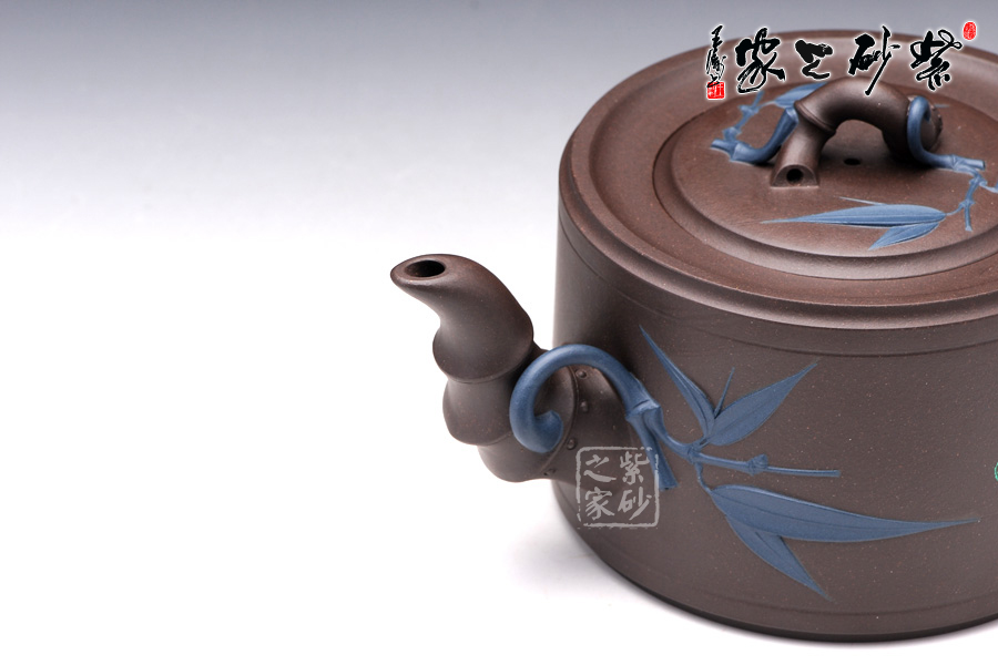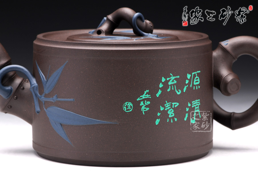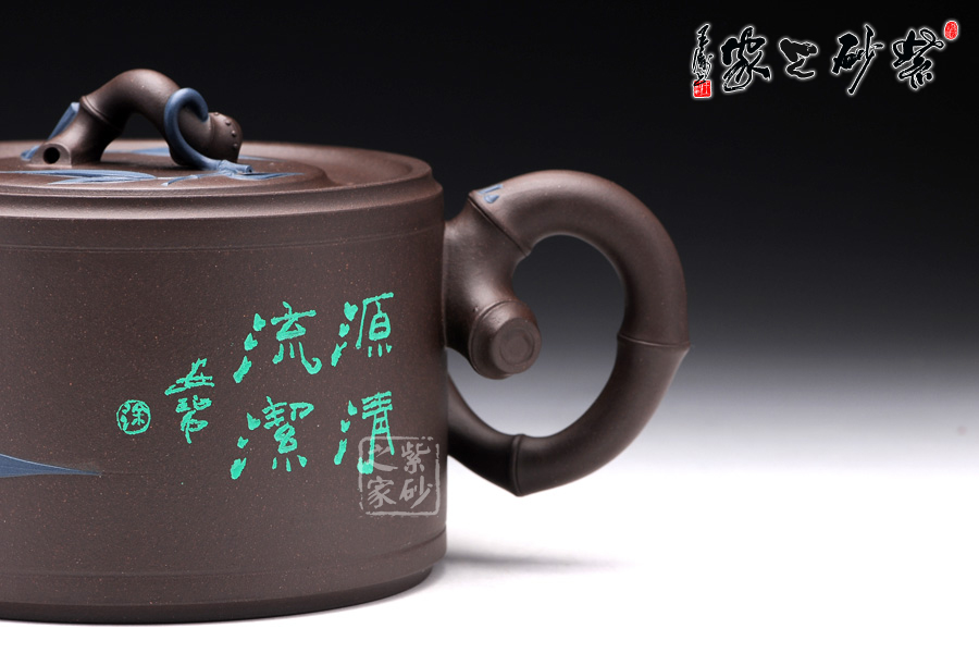 此壺的壺型為經典的花貨“竹段”,以竹為形為意,塑造的作品清新高雅,大氣雅致;這款竹段的特點在于壺身,壺身造型為一節(jié)完整的竹段,壺身中段并無竹節(jié)相隔,的流把均是竹段造型,且以民國綠泥裝飾的流把的竹葉貼花,虬曲有力,高風亮節(jié),風姿卓卓;壺鈕與壺嘴均生出竹葉,壺鈕兩側各有兩片竹葉,呈相反方向盤桓;壺嘴靠近壺身第一節(jié)竹段上生出一小枝,枝頭上四片竹葉,一片向上迎風翻卷;竹節(jié)壺把曲線流動,遒勁有力;嵌蓋,嚴絲合縫,吻合完美無縫;將壺柄提拿起來,幾個竹節(jié)自然將手指穩(wěn)住,絲滑無滑膩之感;此壺壺身由陶刻大師徐安碧親自操刀篆刻,壺身正面鐫刻的是“源清流潔”四個字,反面鐫刻的是“一葉香茗藏世界,半壺清泉煮乾坤”。
