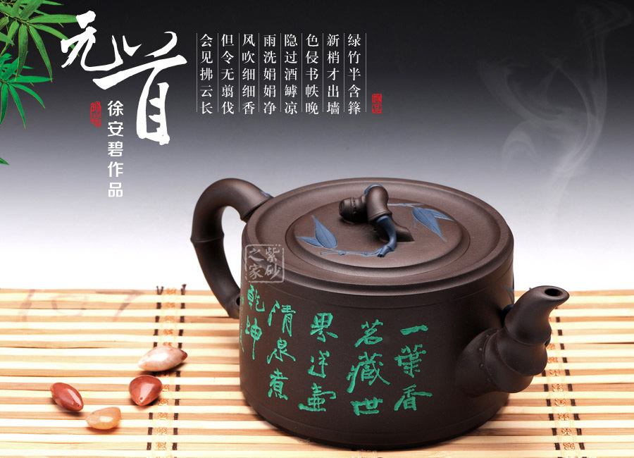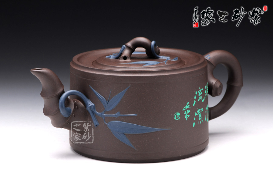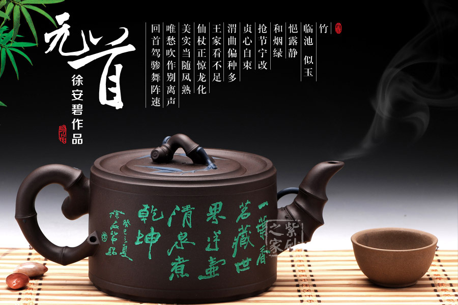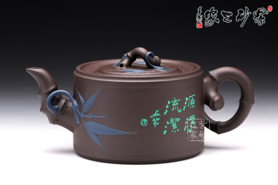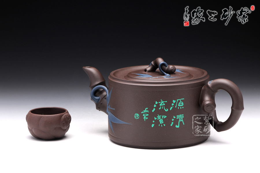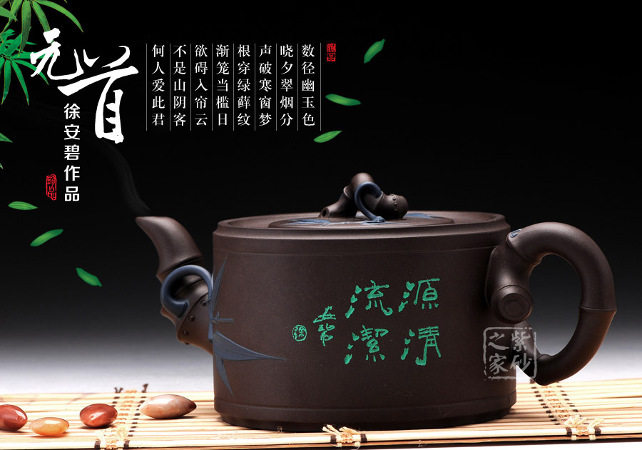 此壺的壺型為經典的花貨“竹段”,以竹為形為意,塑造的作品清新高雅,大氣雅致;這款竹段的特點在于壺身,壺身造型為一節(jié)完整的竹段,壺身中段并無竹節(jié)相隔,的流把均是竹段造型,且以民國綠泥裝飾的流把的竹葉貼花,虬曲有力,高風亮節(jié),風姿卓卓;壺鈕與壺嘴均生出竹葉,壺鈕兩側各有兩片竹葉,呈相反方向盤桓;壺嘴靠近壺身第一節(jié)竹段上生出一小枝,枝頭上四片竹葉,一片向上迎風翻卷;竹節(jié)壺把曲線流動,遒勁有力;嵌蓋,嚴絲合縫,吻合完美無縫;將壺柄提拿起來,幾個竹節(jié)自然將手指穩(wěn)住,絲滑無滑膩之感;此壺壺身由陶刻大師徐安碧親自操刀篆刻,壺身正面鐫刻的是“源清流潔”四個字,反面鐫刻的是“一葉香茗藏世界,半壺清泉煮乾坤”。
