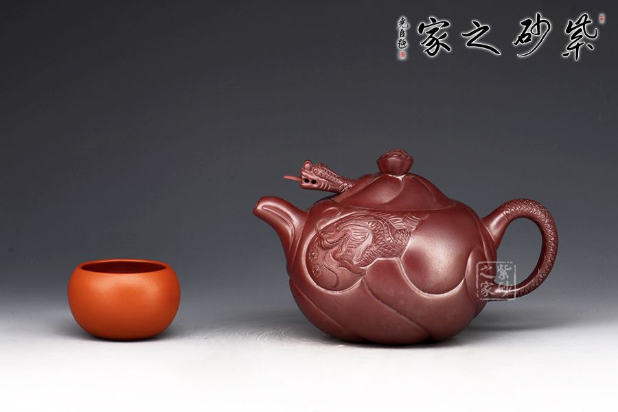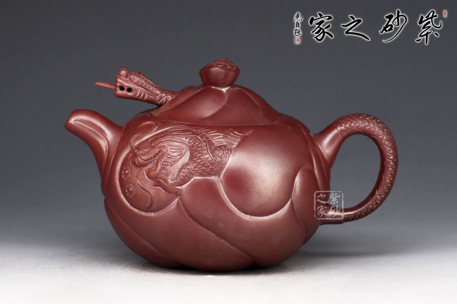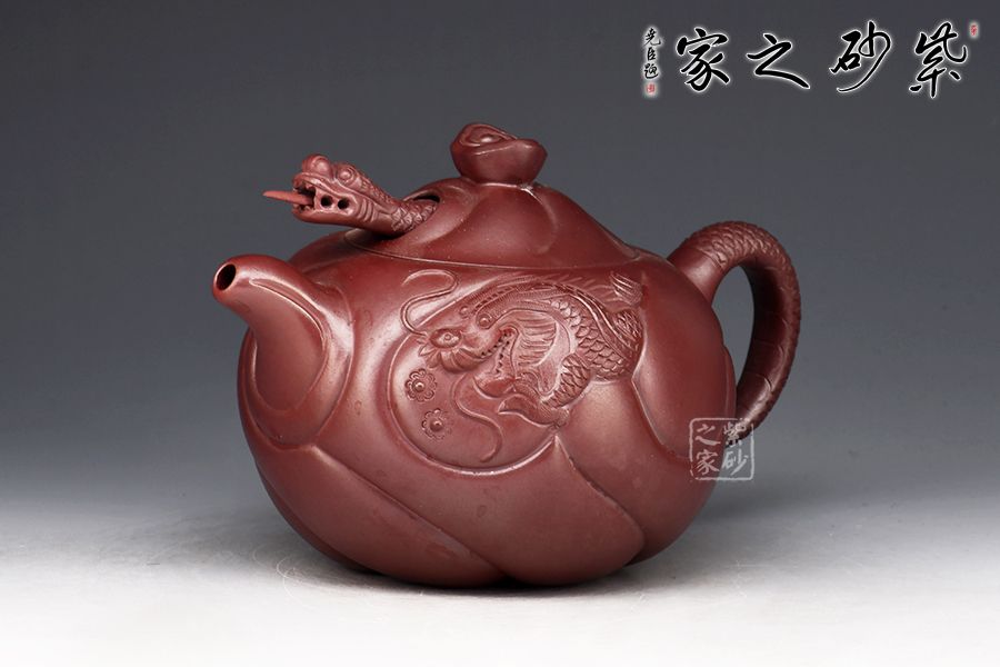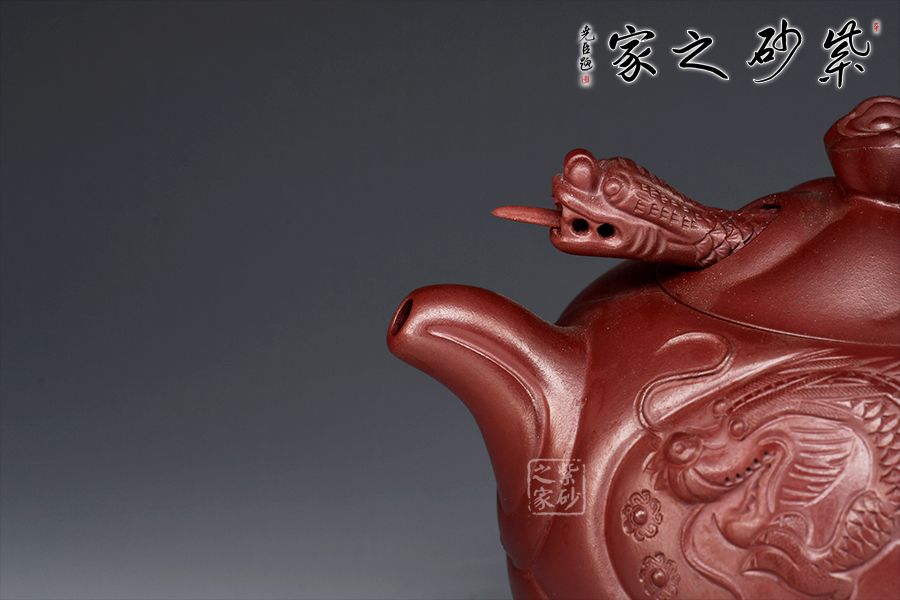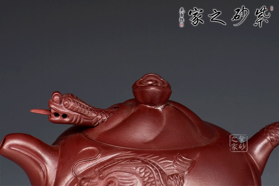 左側(cè)探出立體雕出的龍頭。龍頭可伸縮,傾茶時(shí),龍頭伸出,同時(shí)龍頭里又伸出一根細(xì)的舌頭。