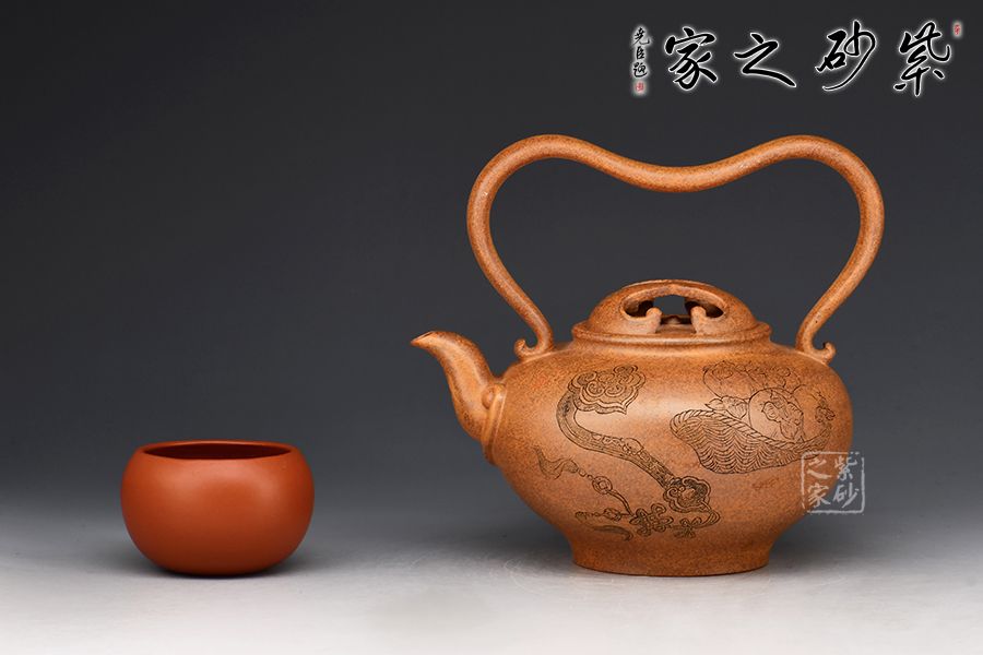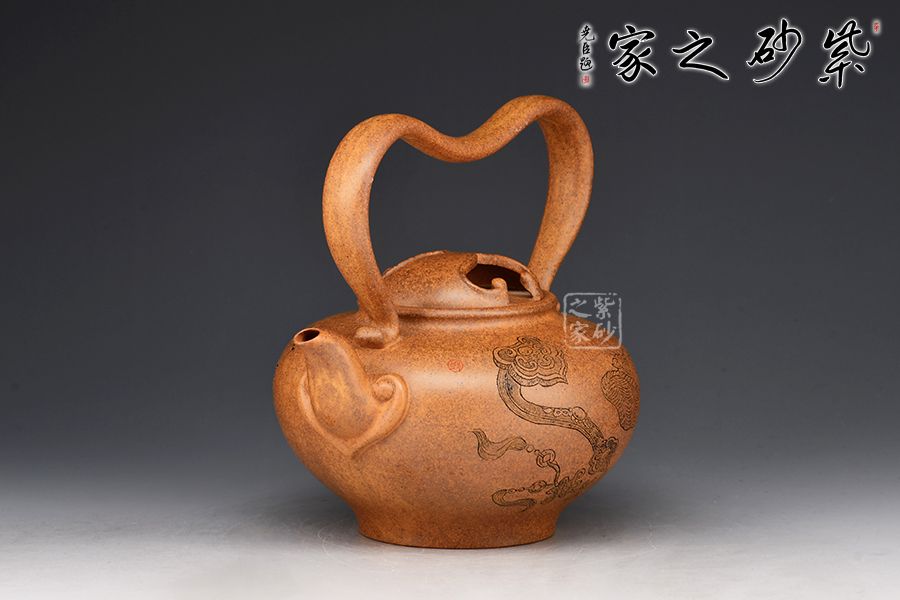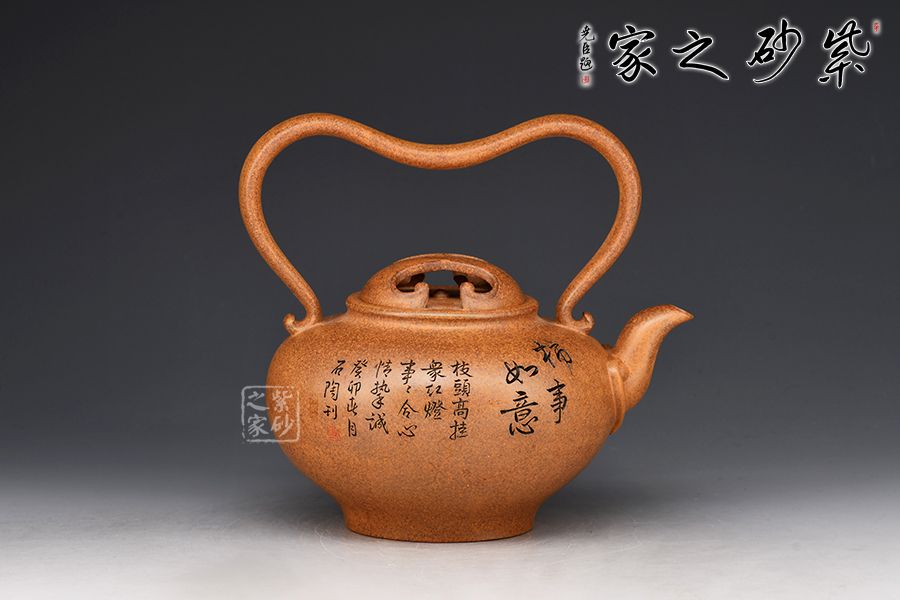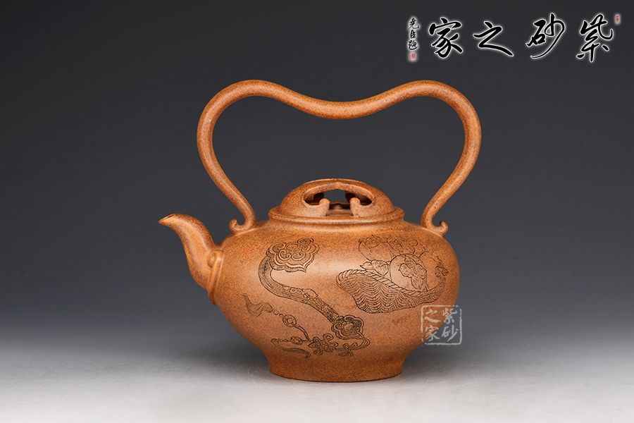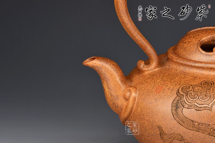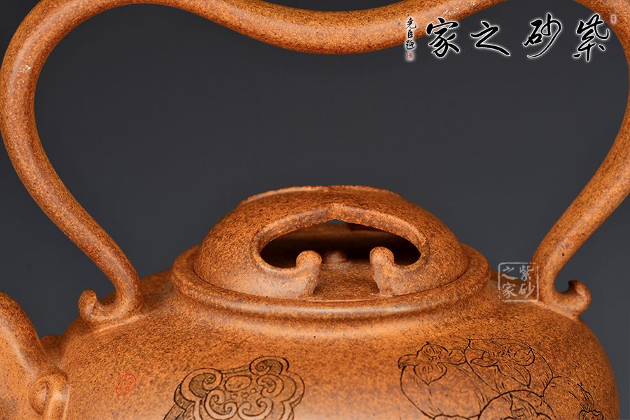 該壺壺腹飽滿,壺身線條流暢自然。壺嘴直流向上,出水爽利。以提梁代替壺把,粗細(xì)有致,形狀似心形,凹進(jìn)去的地方剛好方便拿捏。壺蓋以牛蓋的形式來表現(xiàn)非常新穎,嵌蓋絲密嚴(yán)縫做工實屬不易。壺身由名家 邱爽雙面陶刻,正面刻繪一柄如意,一筐柿子;反面刻繪“柿柿如意”四個大字,前后呼應(yīng),佳器一把,推薦收藏!